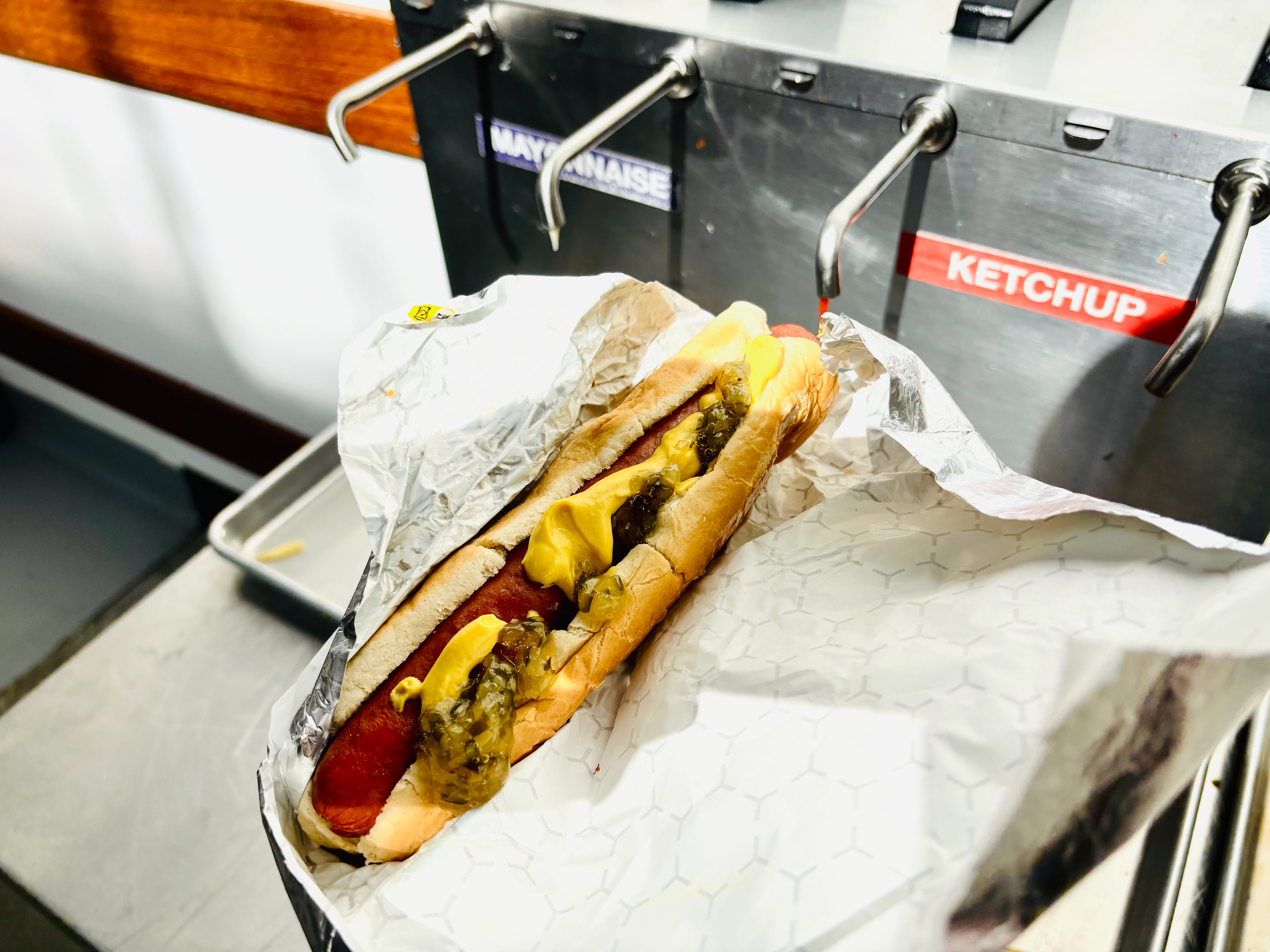 The hot dogs fared much better. I’m not a big hot dog eater and growing up, when offered the choice, I always went with the hamburger. I wasn’t sure if French people put mayo on their hot dogs, which was offered in the dispenser, but I went with mustard and relish on mine. I added some ketchup after I took the picture because I know there’s a whole hoo-haa about not putting ketchup on hot dogs. But I’m already in enough hot water as it is and since they didn’t have choucroute (sauerkraut), I needed something tomatey to get the taste of the pizza out of my mouth, and mind.
