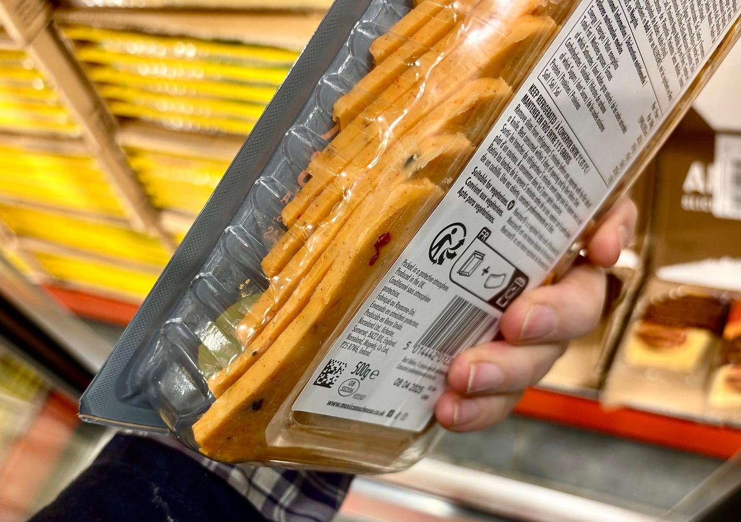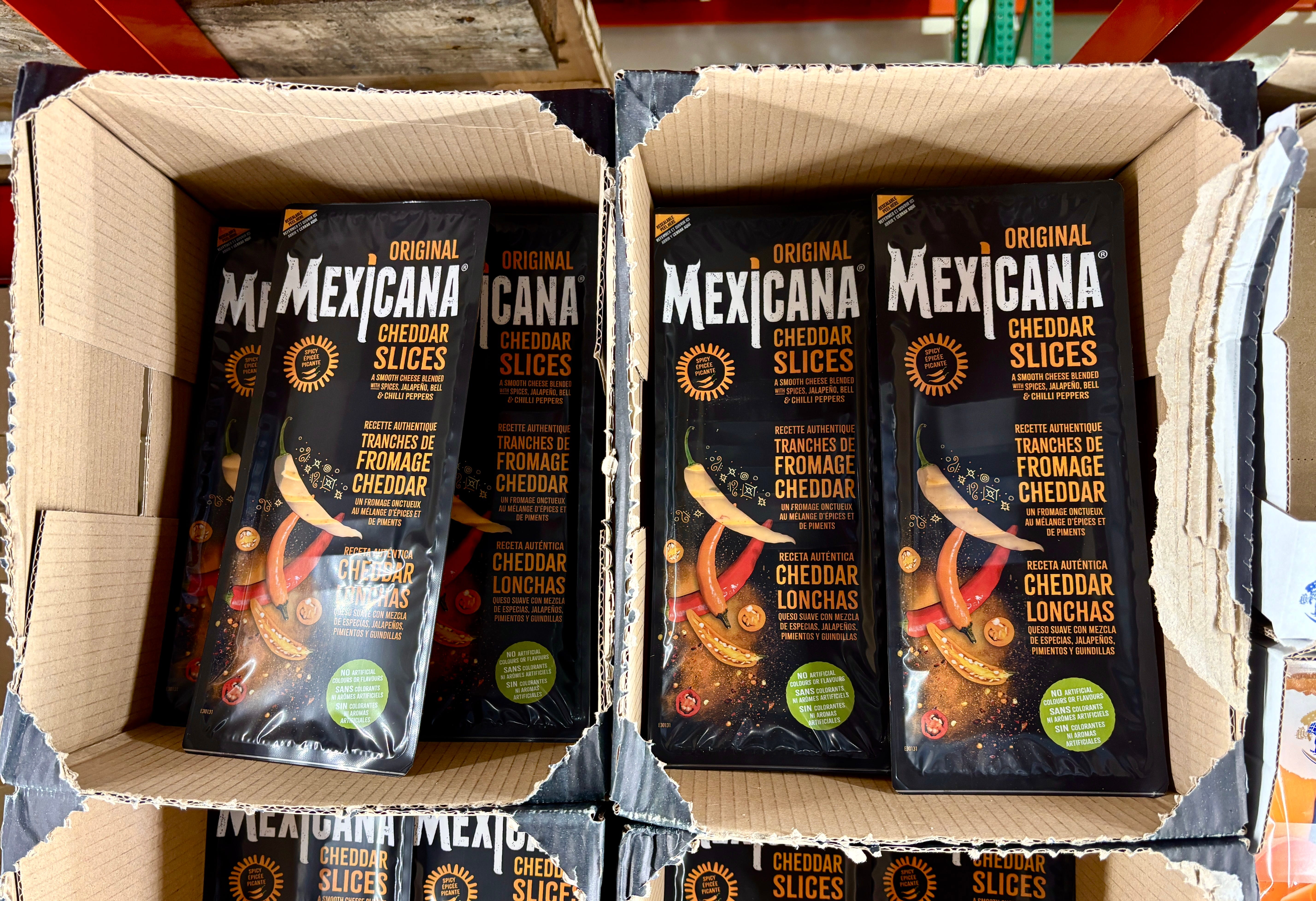 Mexico makes some very good cheeses, but I wasn’t aware that cheddar cheese was part of their culinary canon. But they had some cheese labeled as “original” Mexicana cheddar slices.