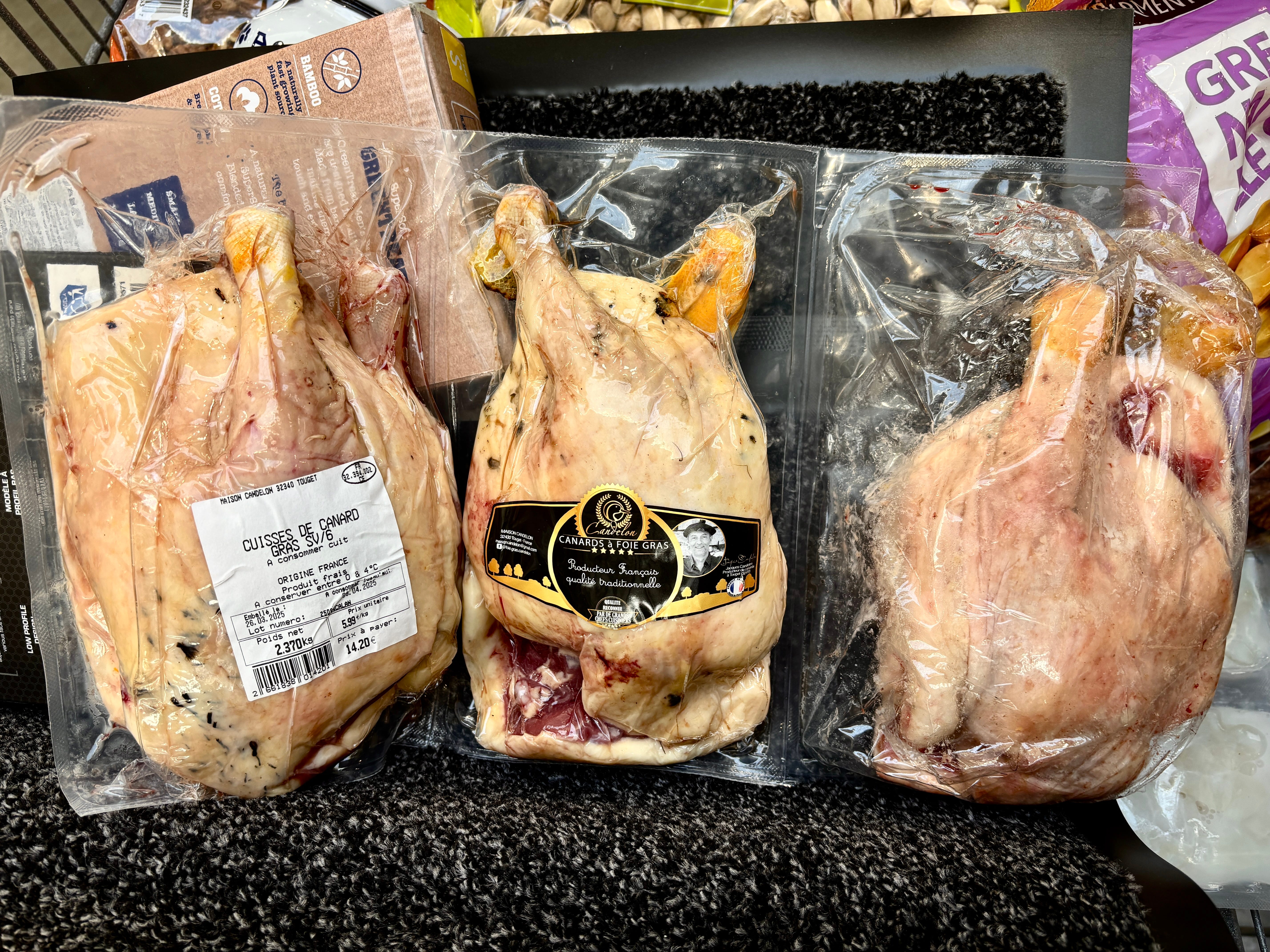 I bought the six duck thighs, above, to make my easy duck confit since my cousin was coming from the U.S. to visit and she loves confit. The labels said the ducks were gras (fat) and yikes, they weren’t kidding. Around 3 cups (700ml) were rendered out as I slowly baked them in the oven, which usually only a few tablespoons render out. So I saved the duck fat and have a few jars in my refrigerator that should last me the rest of my life.
