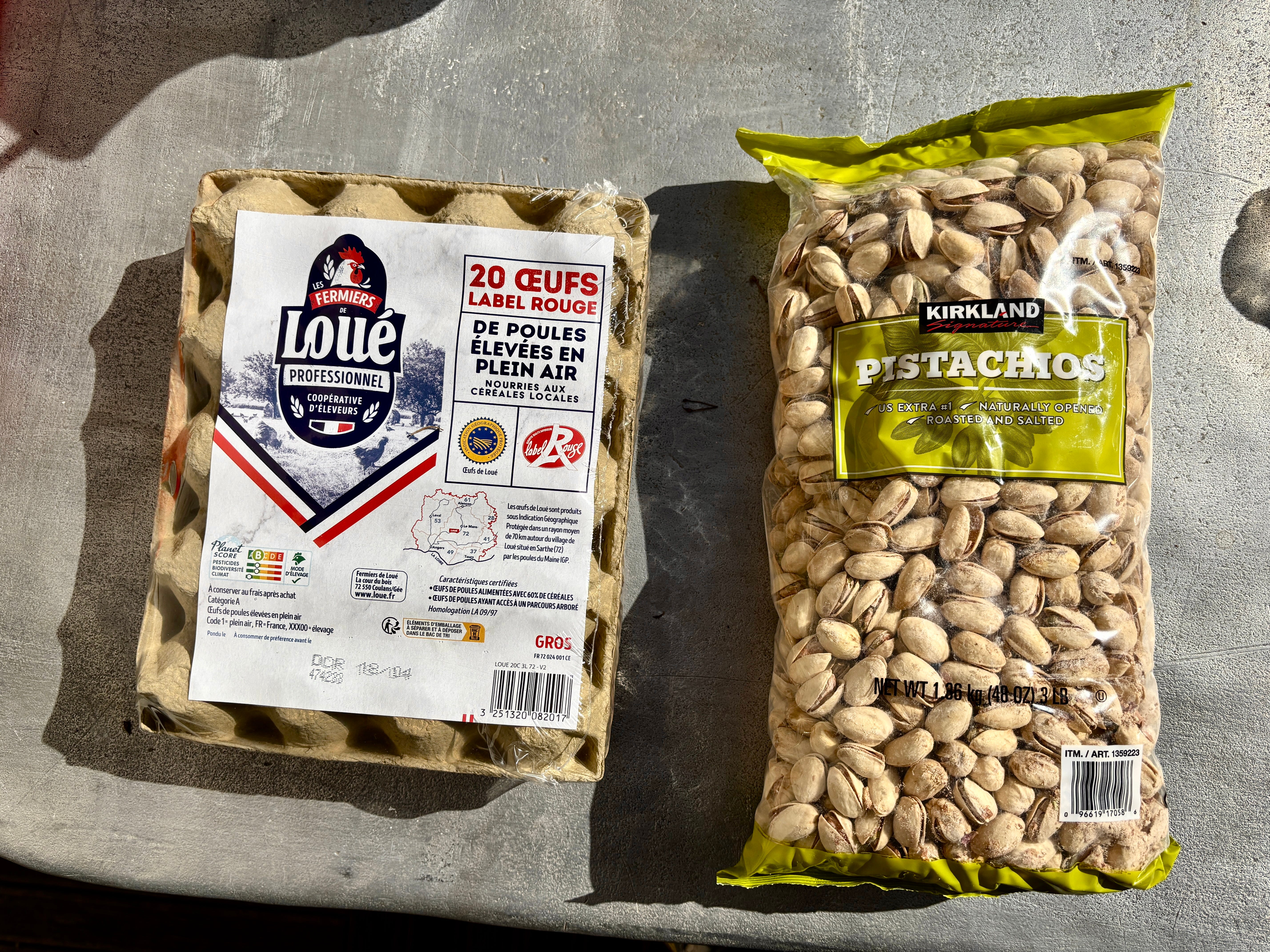 So I picked up a flat of Label Rouge, free-range eggs, which cost €4,80 for thirty eggs. I also got California pistachios, which we love to snack on during apéro hour.
