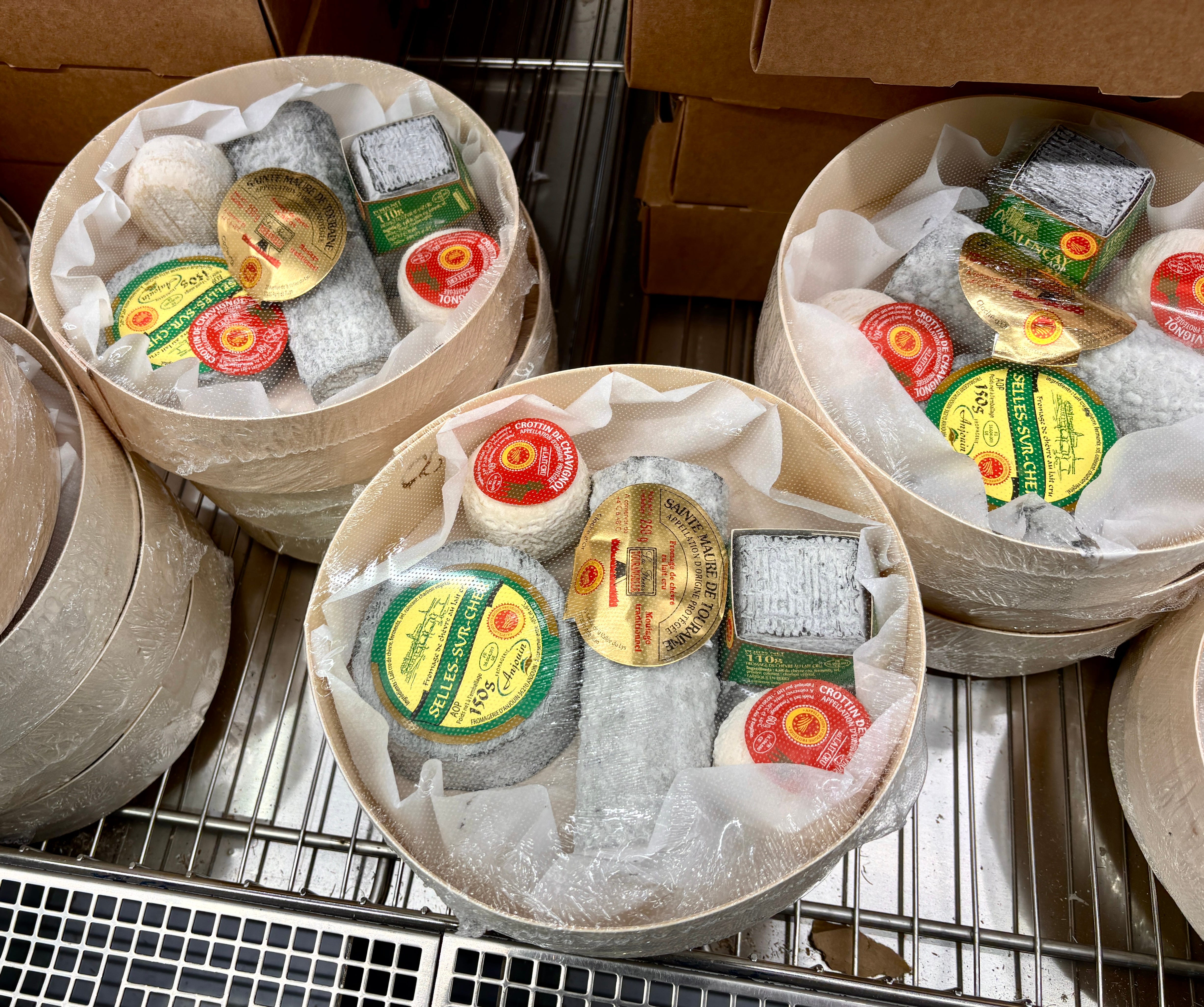 All the cheeses in the packages have the yellow and red AOP seal on them, a quality assurance label for cheeses in France, and in Europe, that are produced under very specific standards and conditions, such as being made with raw milk and created from milk from a specific region.