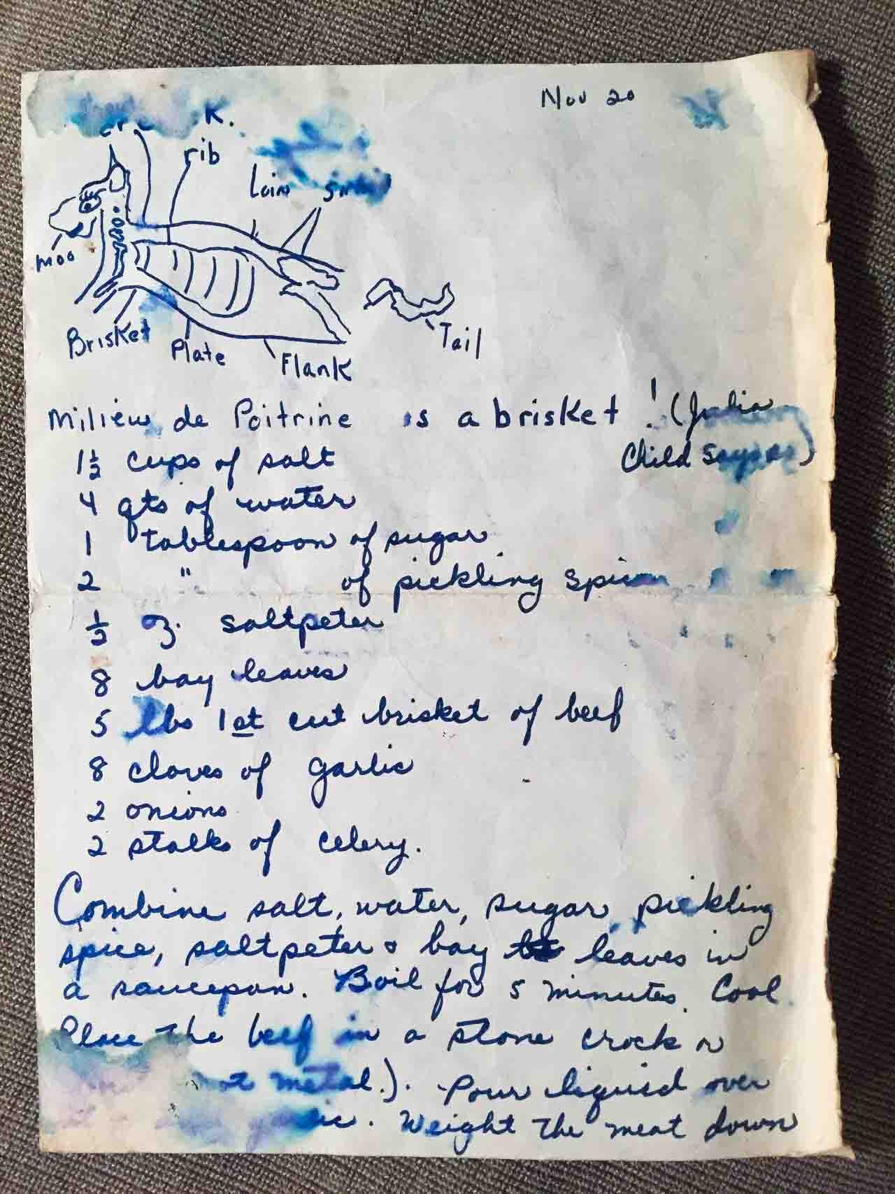 It’s one of the cuts of meat that Americans who’ve moved to France ask me about finding. One wholesale butcher imports it from the U.S., but they only sell to professionals, and you have to buy the whole thing, which is a lot of beef. (And…freezer space.) I wrote about what to use in France here, accompanied by the diagram below, which came with a recipe a friend’s mother gave me. She moved here in the 1950s when she married a Frenchman and next time I go, I’m going to pick up a brisket for her. How times have changed…