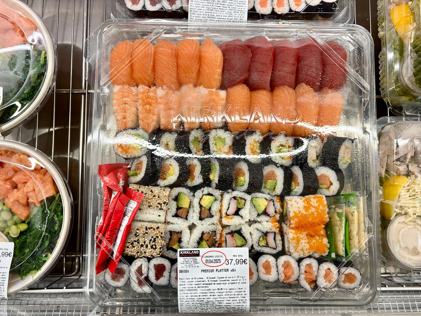 There were “premium” les sushis packed in plastic platters, large and small…