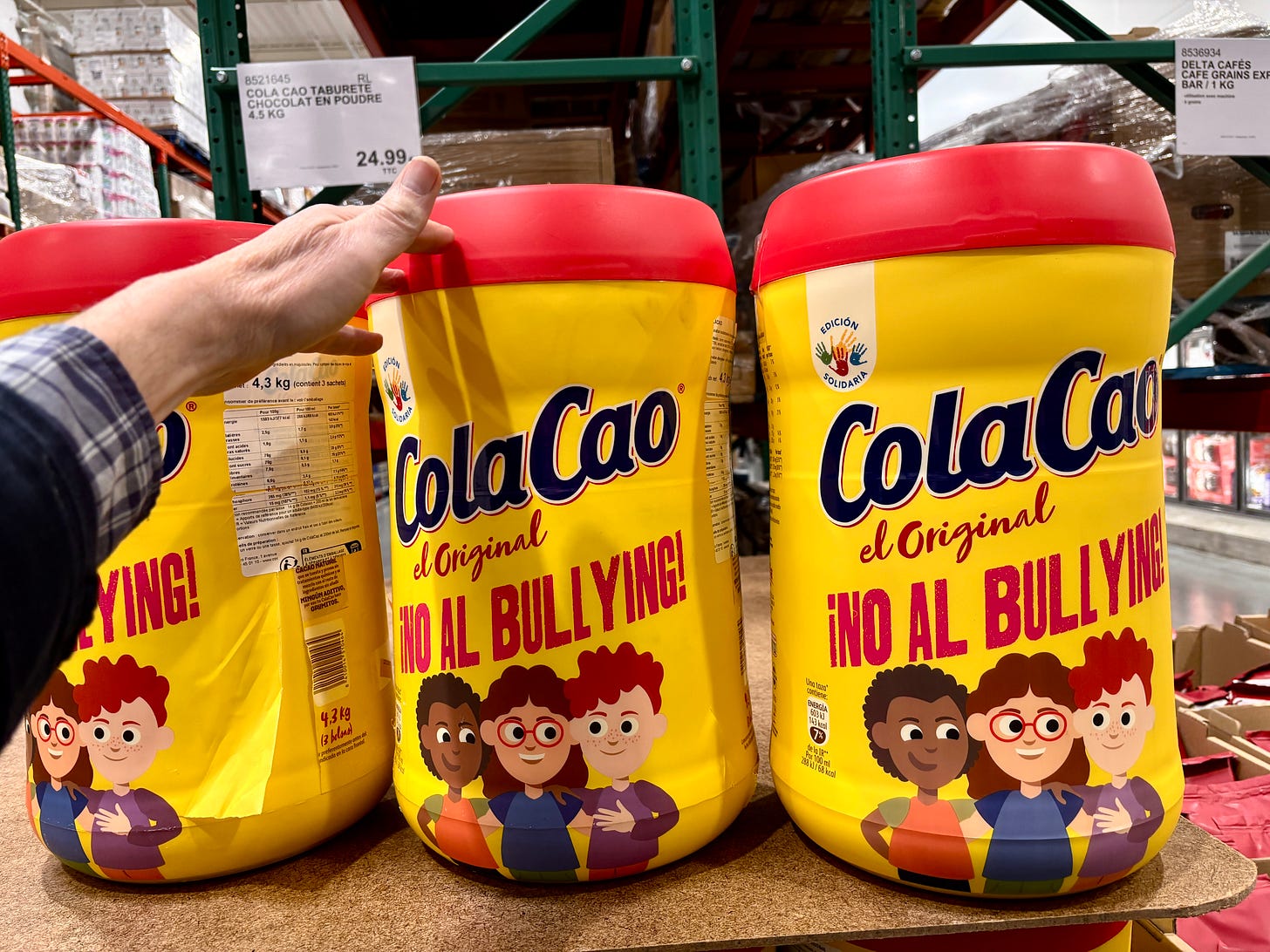 And those giant canisters below were startling in size, each one was as big as a footstool — I kid you not. I think this is a cocoa drink? (Although, not sure how the “cola” designation fits in.) But there’s a prominent anti-bullying message on it, which is a nice message to pass on to the next generation.