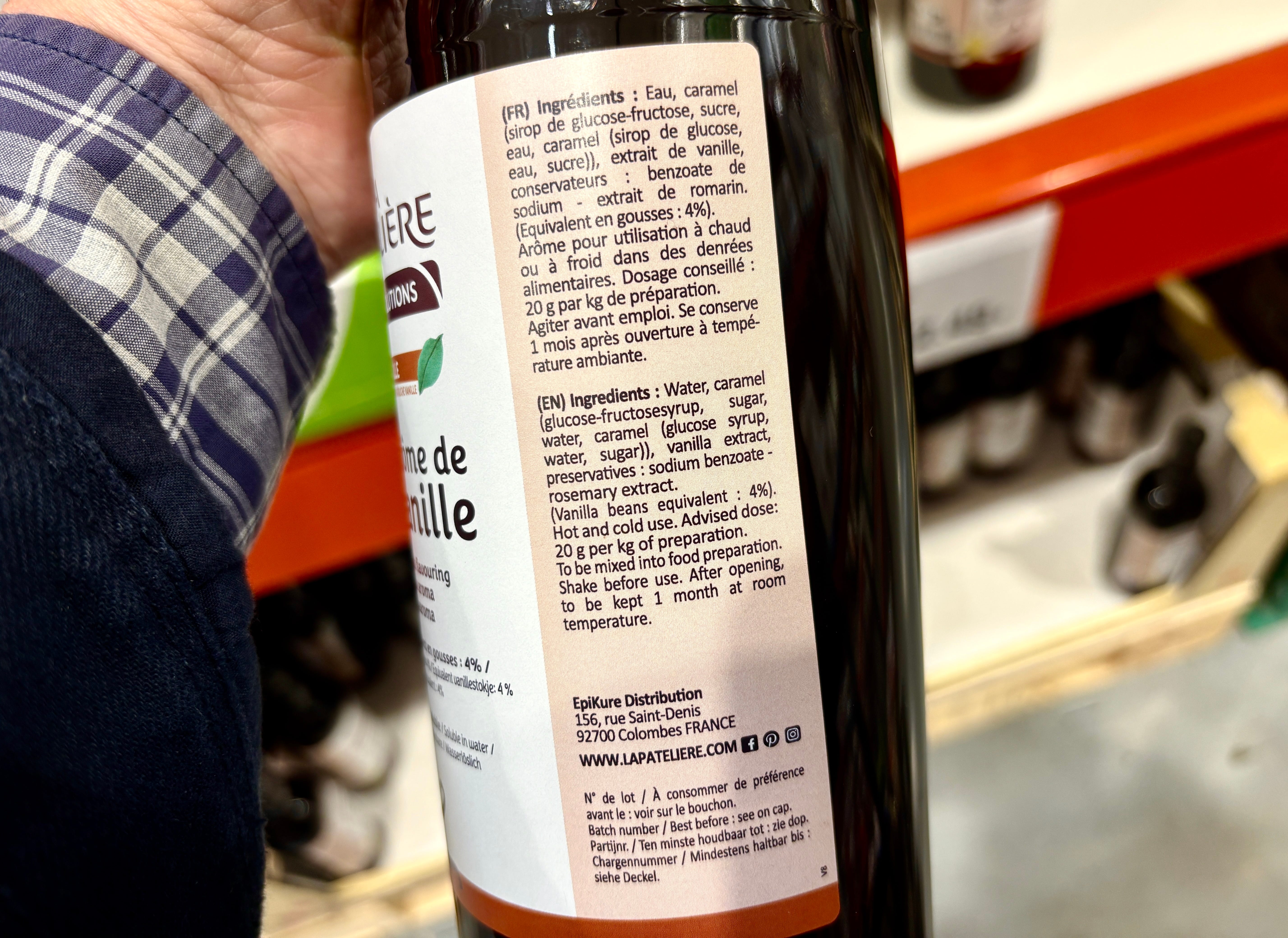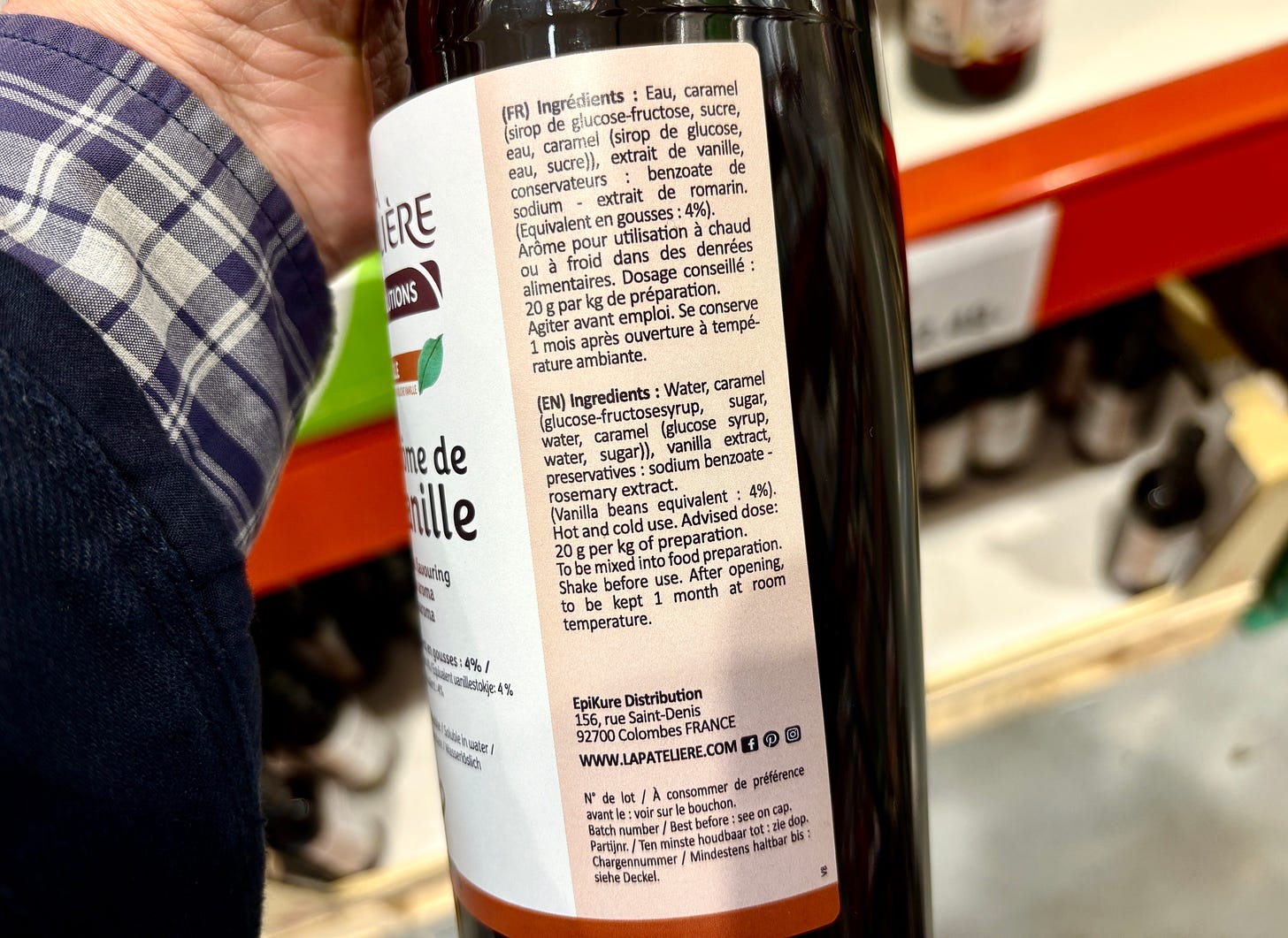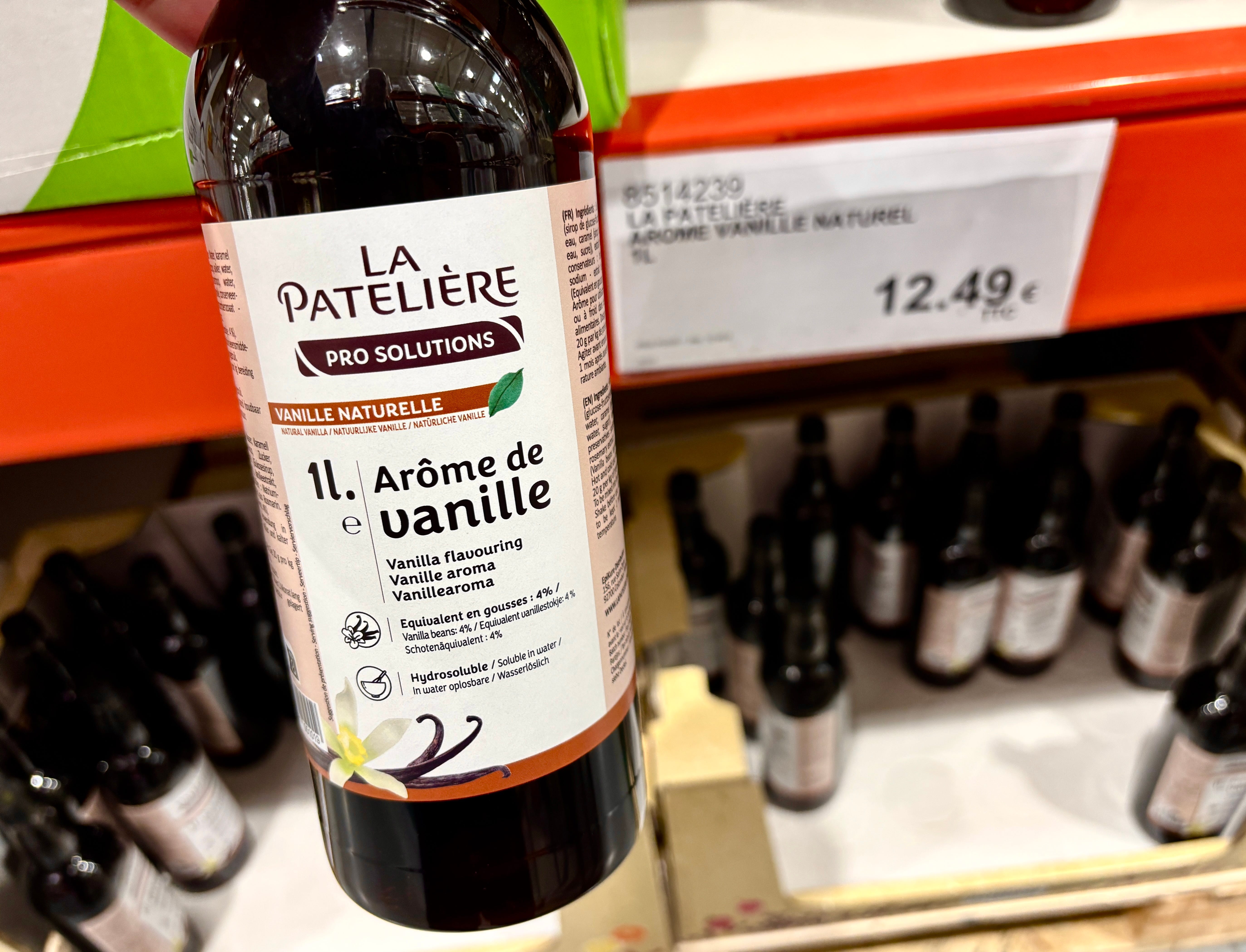 Whereas in the very same aisle, if you want real vanilla, you have to settle for vanilla arôme, which is made from water, caramel, glucose, fructose, sugar, sodium benzoate, with 4% vanilla listed last, right before the preservatives.