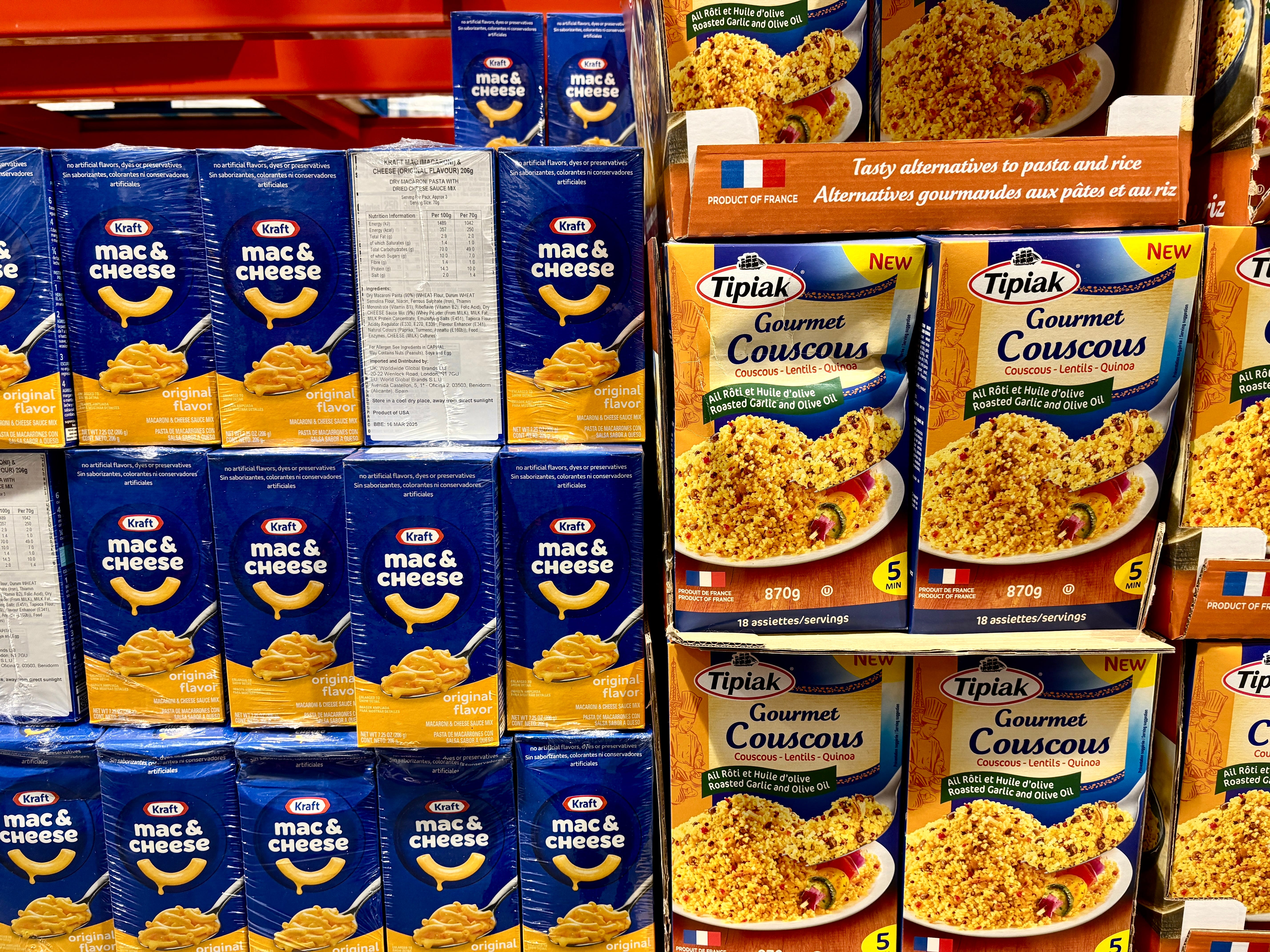 Also in the grocery aisle, Mac & cheese is proudly displayed next to couscous. I once bought a box of Kraft Mac & cheese when I saw it in Paris, remembering it nostalgically from having it as a kid.
