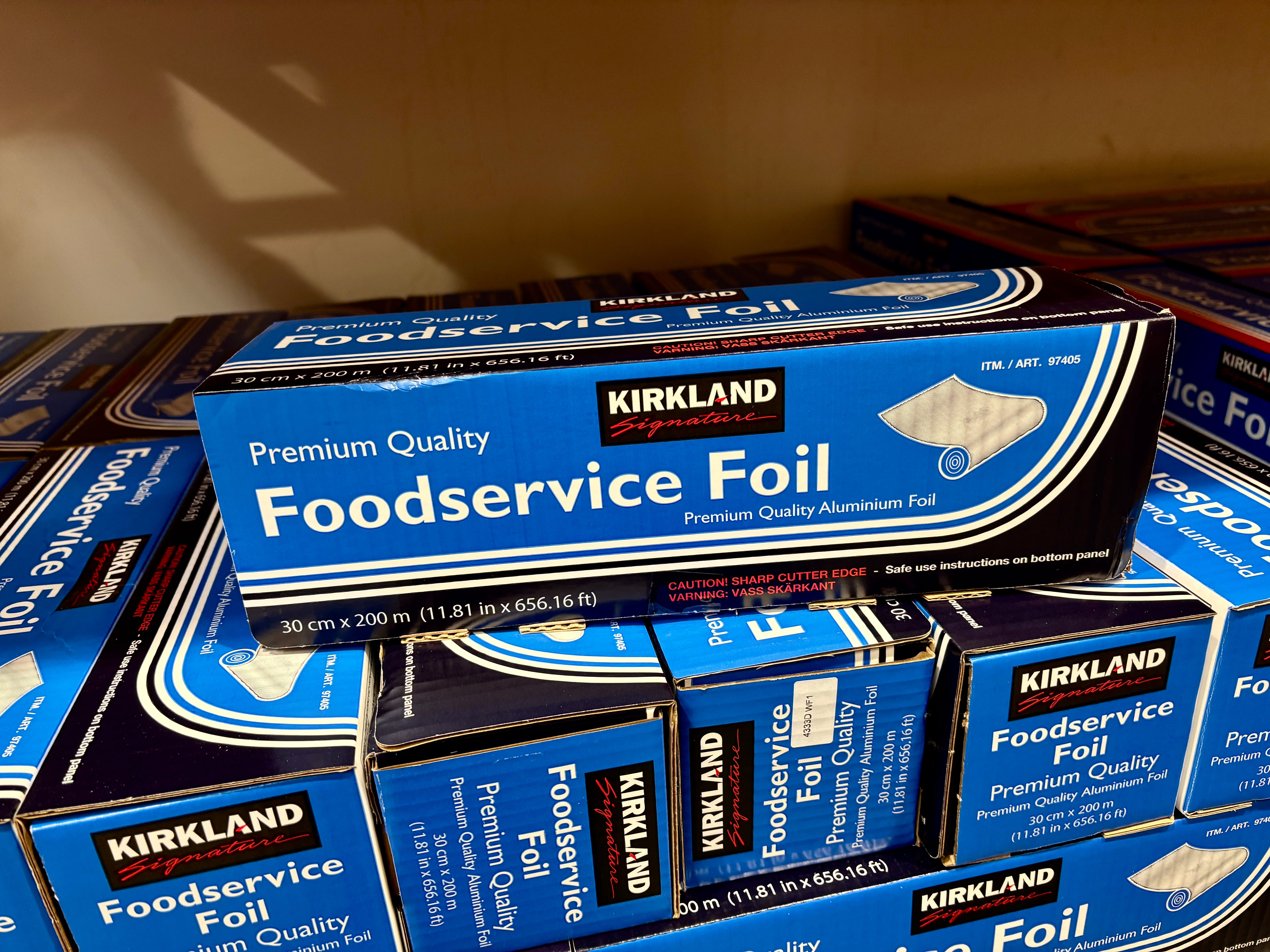 The boxes of foil they carry are too big for my kitchen, and I’m well-stocked on Reynold’s Wrap. But I’m intrigued by the Kirkland moniker, so maybe it’s better than what’s sold here, even the stuff for professionals at Metro. But I’m not sure I want to give up 15% of my kitchen counter space for a roll of foil.