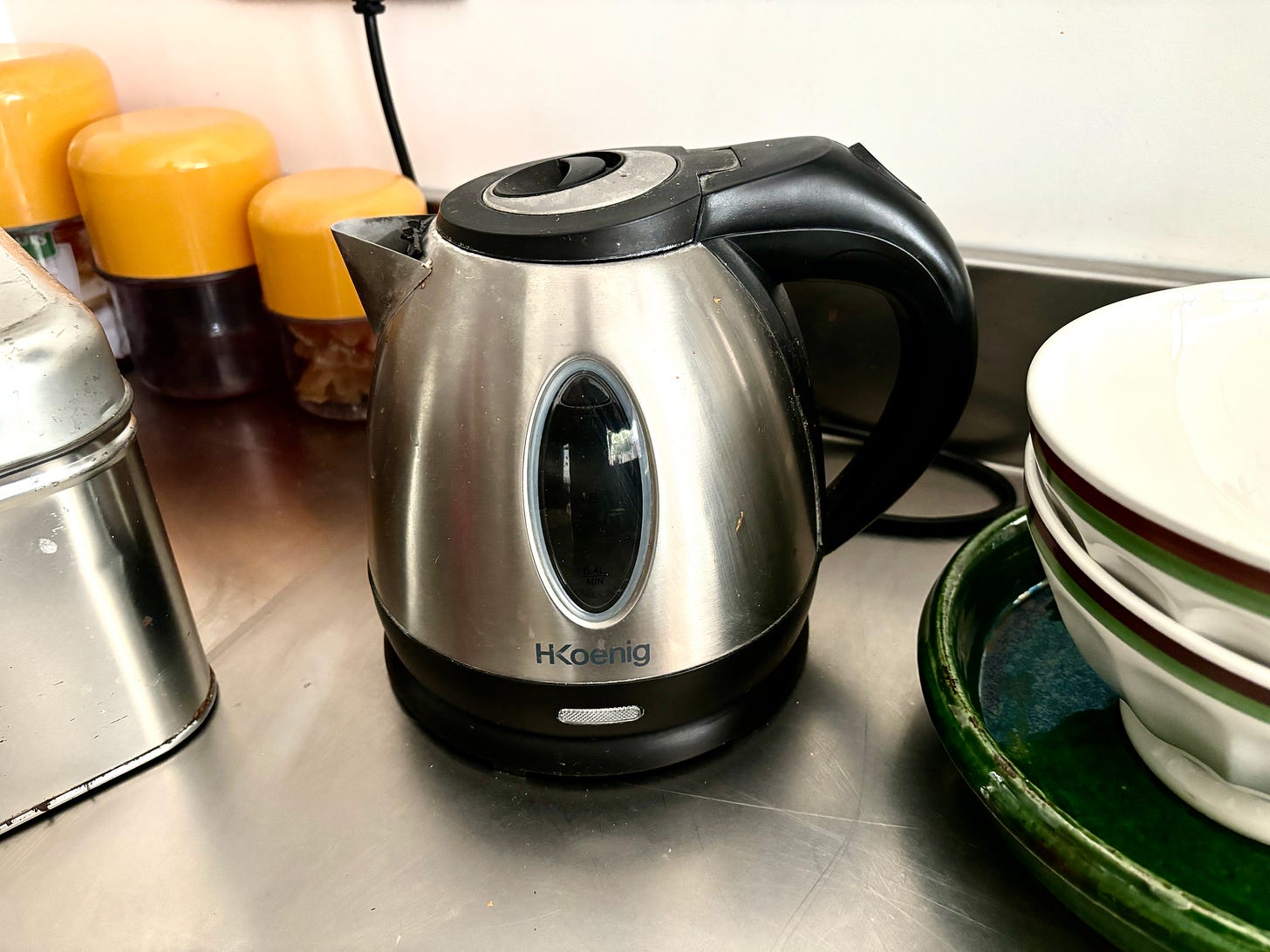 Kitchen counter space is a big deal for me, but I’m happy to share some with my hot water kettle. Some kettles with a lot of bells and whistles, and people who brew coffee and tea carefully enjoy having temperature controls, but we’re fine with our simple model that has an On/Off switch, and that’s it. I’ve used the Amazon Basics kettle in the U.S., which works well and is affordable, and the H. Koenig one I got in France works fine, although I would say if space is limited, find one with the smallest footprint. (If you have an NYT subscription, Wirecutter reviewed their favorite hot water kettles. CNN, Serious Eats, The Telegraph, and Wired also listed their favorites.)