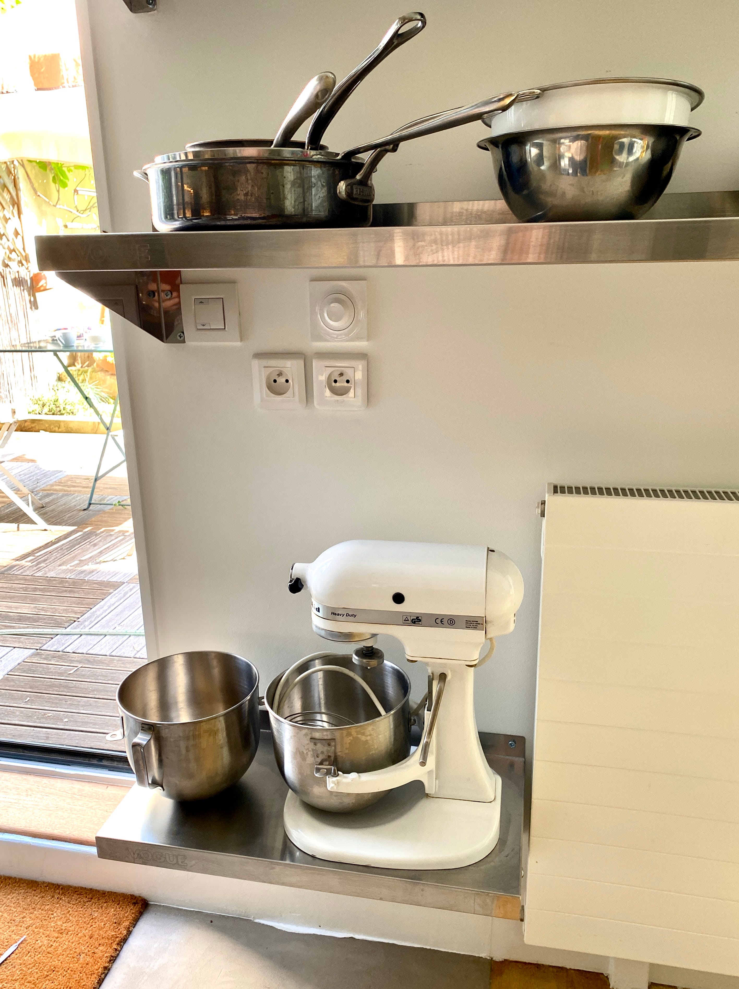 It used to bother me; I honestly didn’t think I could live if my mixer wasn’t always within reach, at the ready. But as a baker with a bit of OCD, I do like putting things in places that specifically fit them. So I found a great stainless-steel shelf that holds my mixer, as well as the extra mixing bowl, perfectly. And it’s a happy compromise.