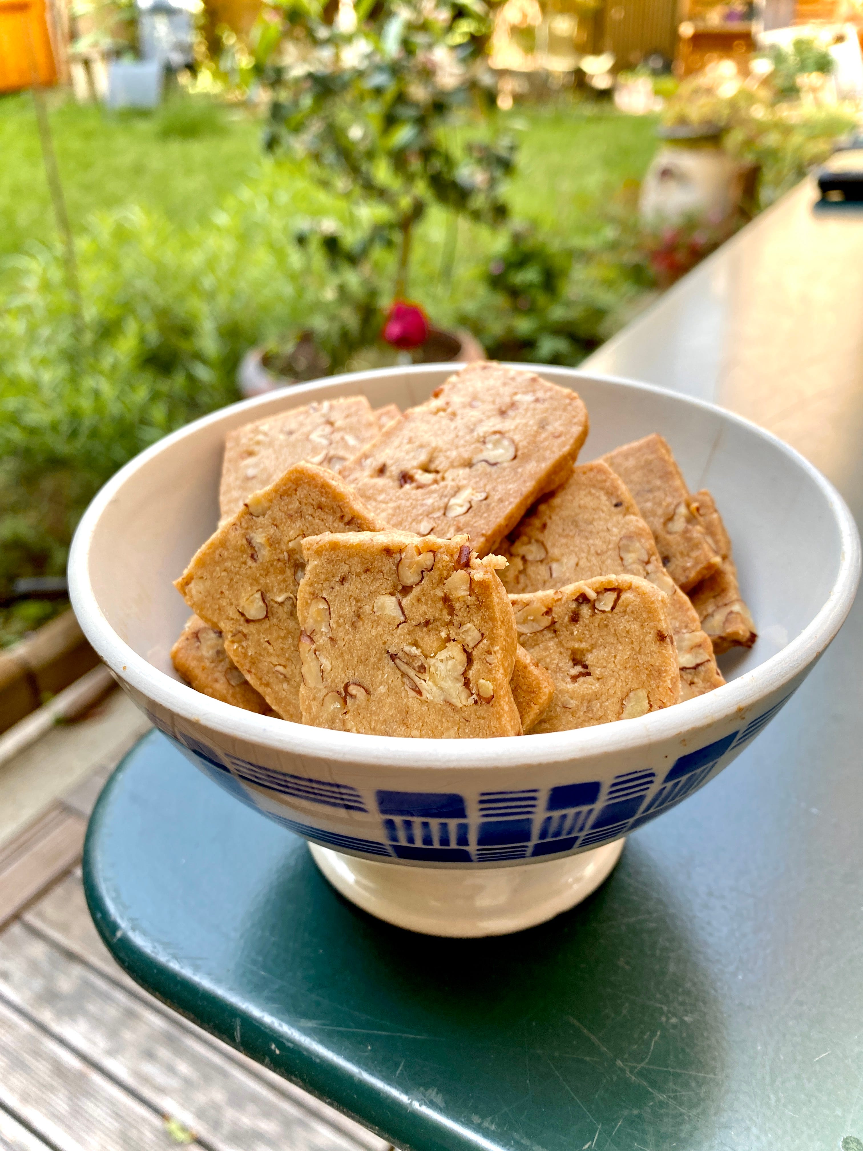 The cookies may crumble a bit at the edges, where the nuts are, when you slice the dough. If that happens, use your fingers to nudge any crumbly bits back into place before baking.
