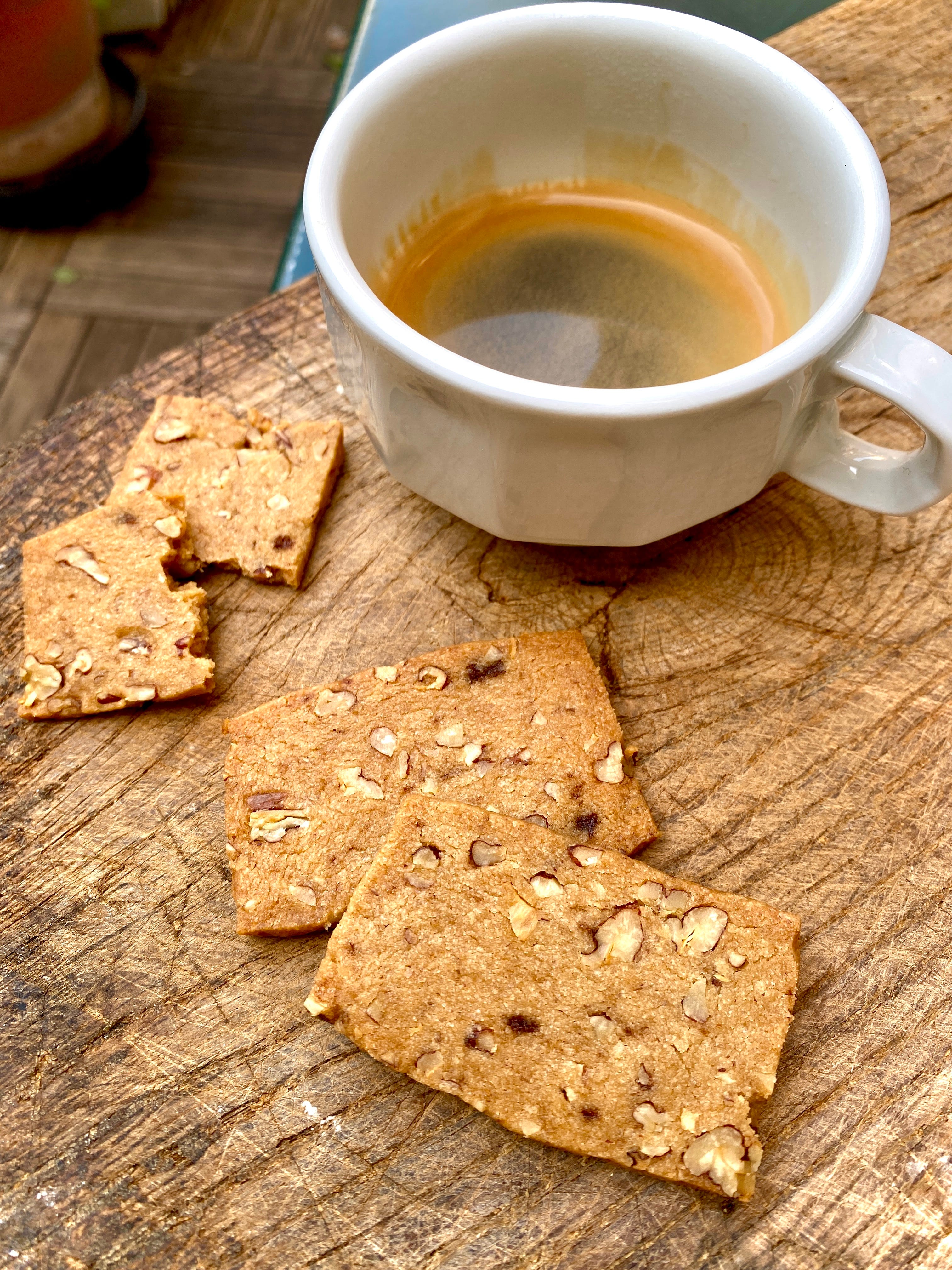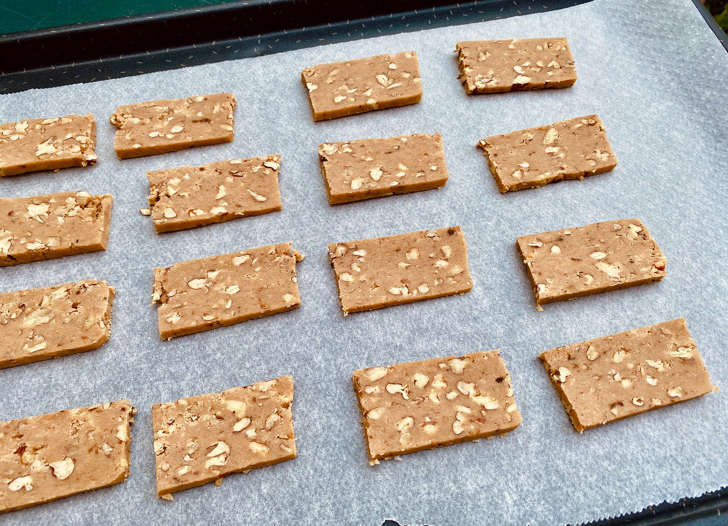 To bake the cookies, preheat the oven to 350ºF (175ºC). Line a baking sheet or two with parchment paper. (You can use a silicone baking mat, but parchment paper ensures the cookies will be crisper.) Trim the rounded edges of the rectangle of dough with a chef’s knife, so the dough is a neater rectangle. Cut the rectangle of dough lengthwise into two pieces, then slice the dough into rectangles about 1/4-inch (about .75cm) thick, and place them evenly spaced apart on the baking sheet(s).