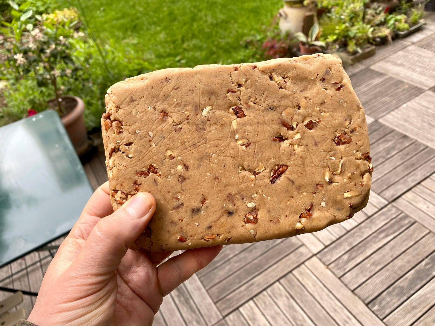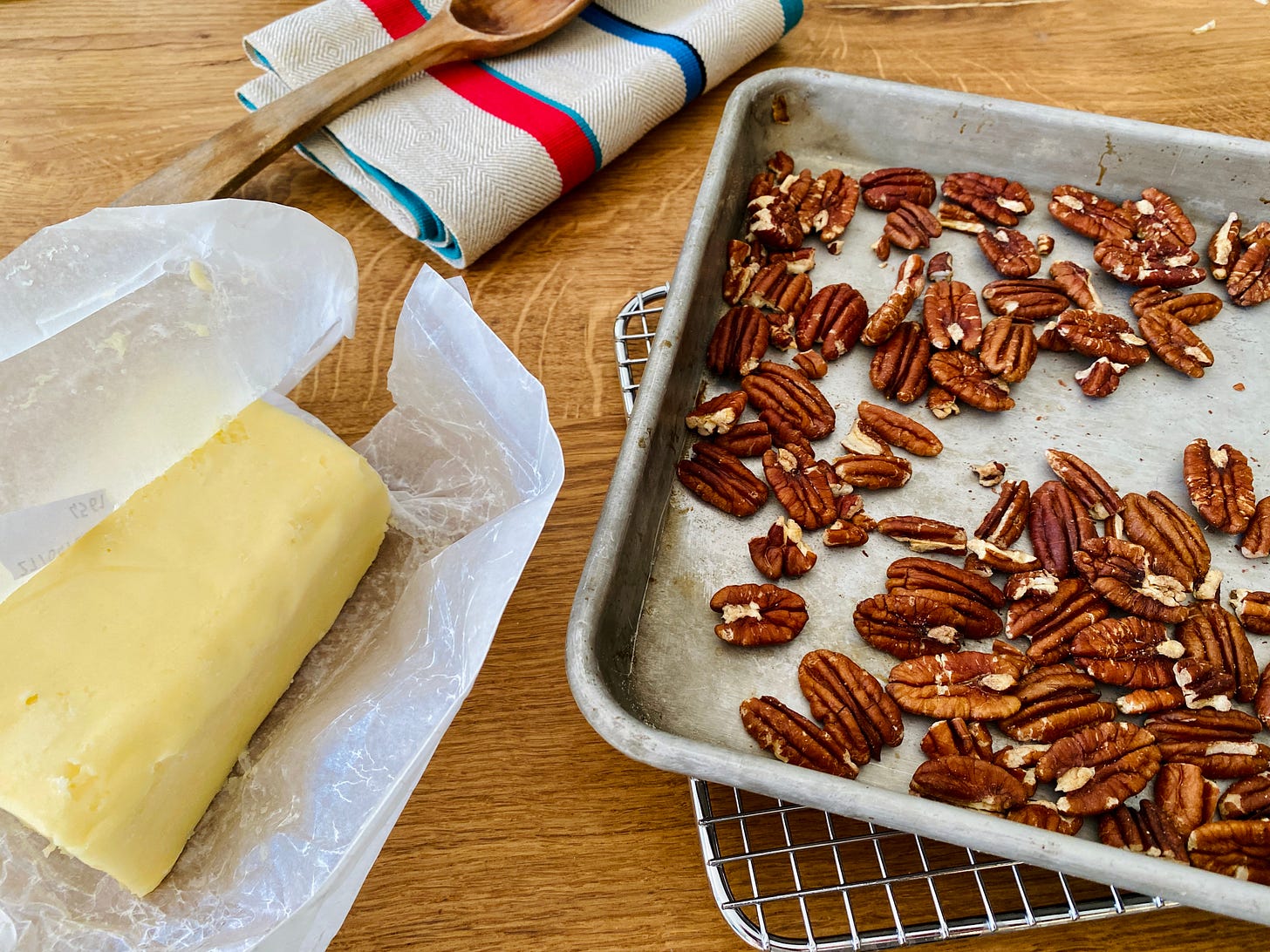 Mix in the vanilla, then the flour mixture, until the flour is completely incorporated. Stir in the pecans. At this point, I finish mixing the dough by hand, kneading it slightly, to get the pecans incorporated and so the dough is smooth.