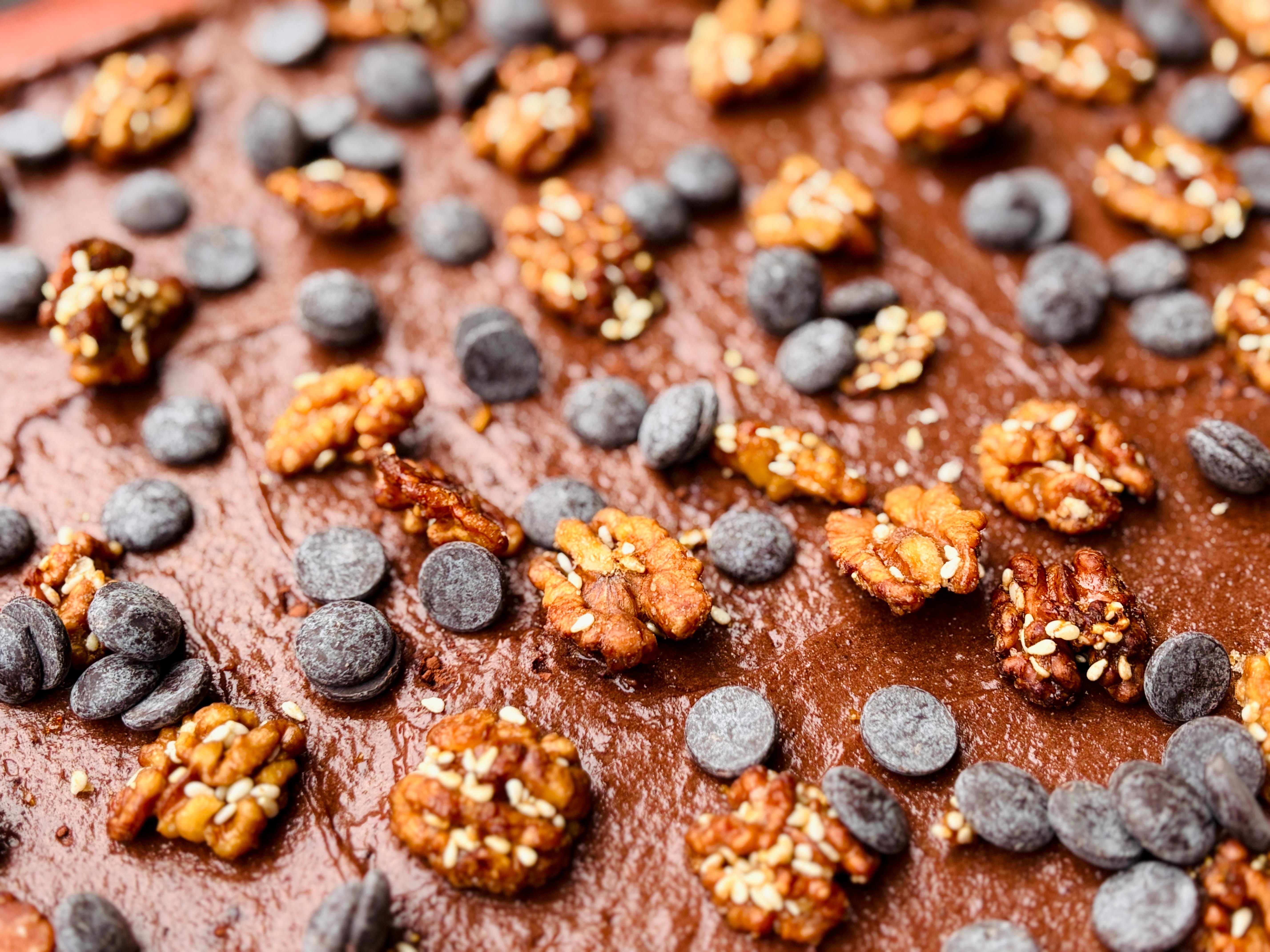 Whisk the sugar into the egg whites in four additions, then stir in the melted butter and whisky or vanilla. Fold in the dry ingredients with a flexible spatula. Spread the batter on the prepared baking sheet so it’s in a thin, even layer (a small, offset metal spatula works best for this). You want to end up with a rectangle that measures about 14 x 10 inches (35 x 25 cm). Top the batter with about 1 1/4 cups (115g) of the walnuts (or more, if you want) evenly spaced over the top, then the chocolate chips.