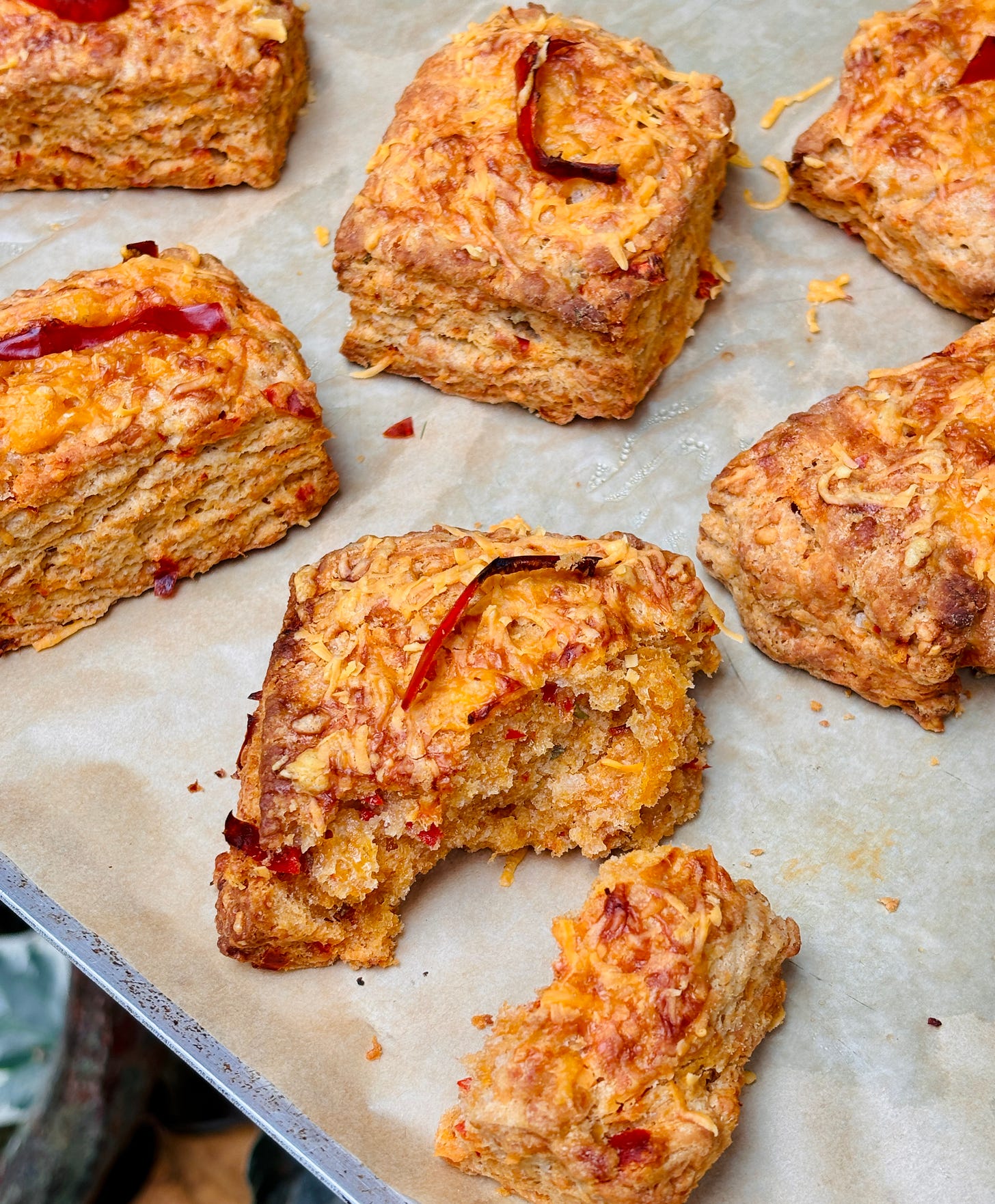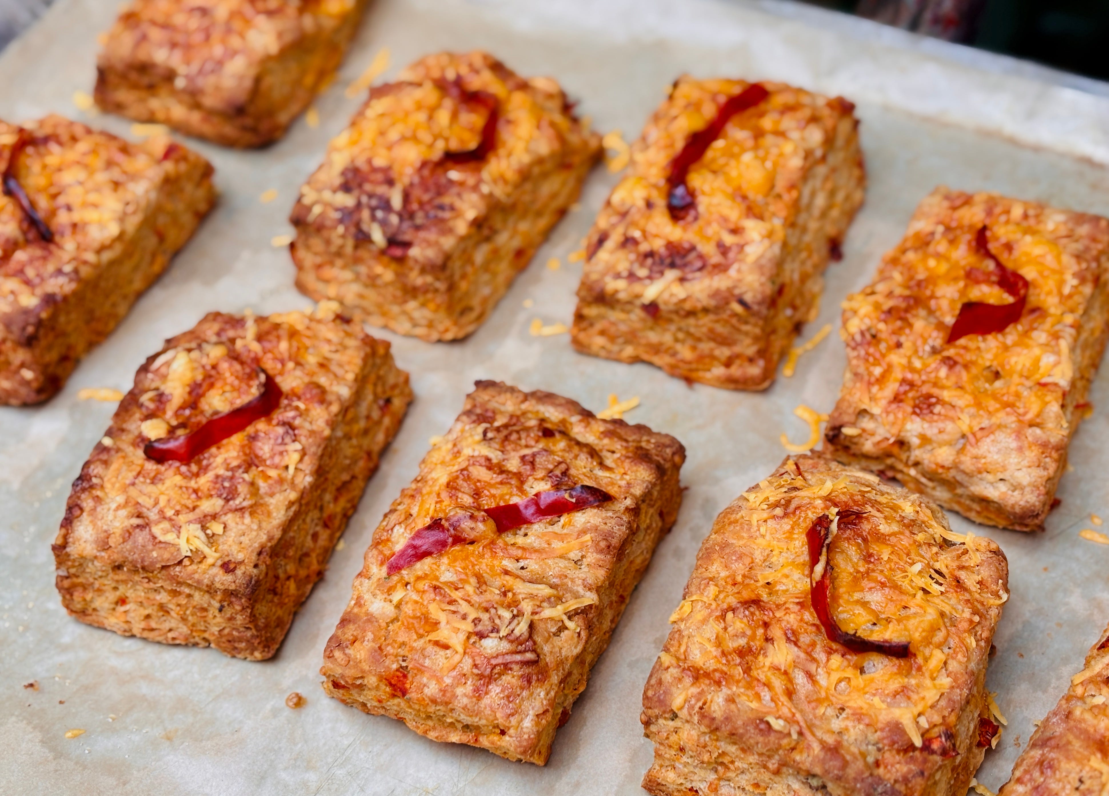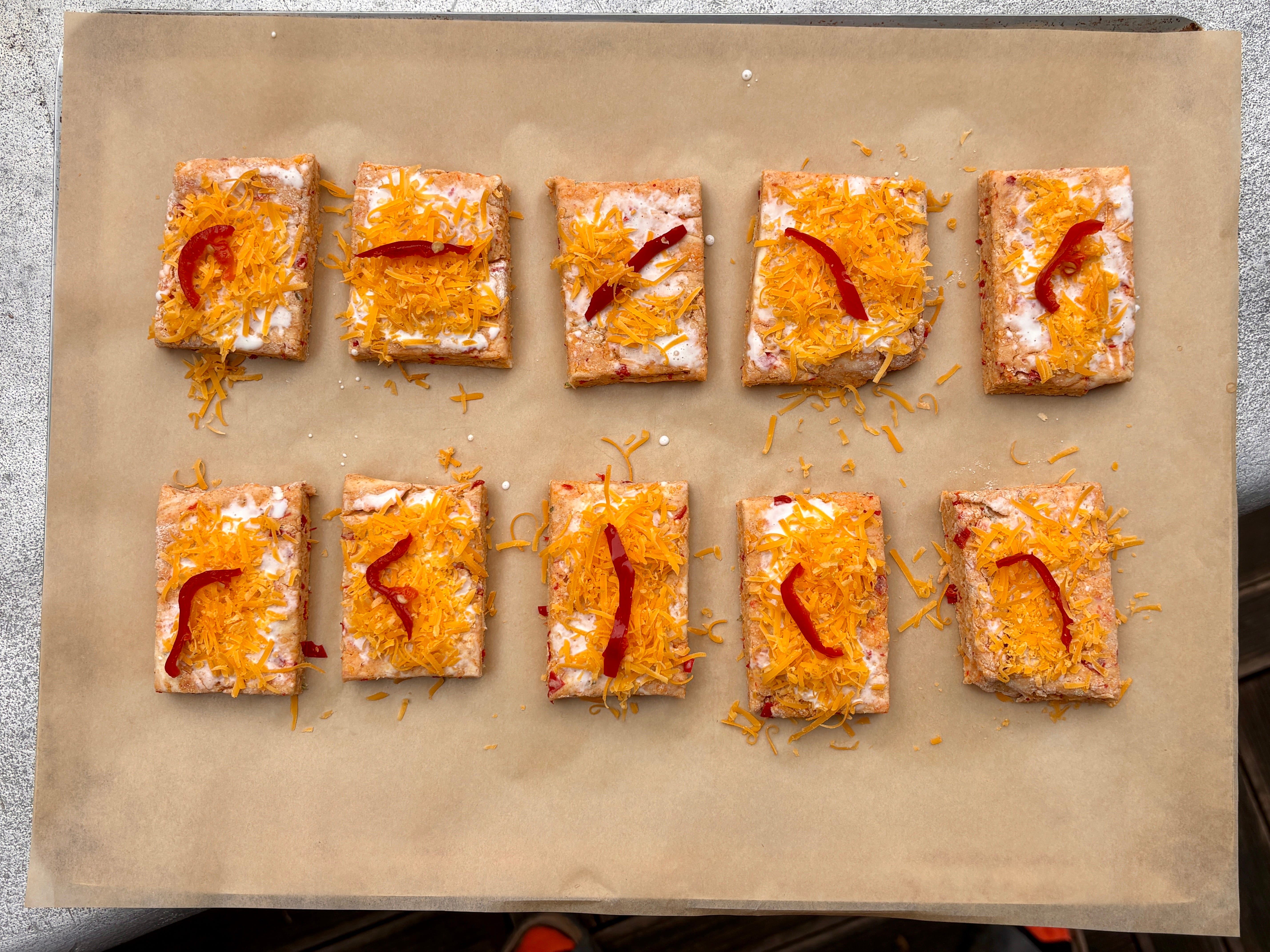 With a rolling pin, roll the dough into a long rectangle measuring 10 x 4 inches (24 x 10cm). Cut the dough lengthwise in half, then cut it vertically, creating ten individual rectangular scones. (You could trim the outside edges of the rectangle to straighten them out before cutting the dough, if you want the scones neater. If you do that, gather the scraps together into a small mound and bake that alongside the scones, which’ll be a baker’s snack.) Place the unbaked scones evenly spaced apart on the baking sheet. Brush the top of each with a little yogurt, then top each with grated cheese and a thin slice of chile pepper.
