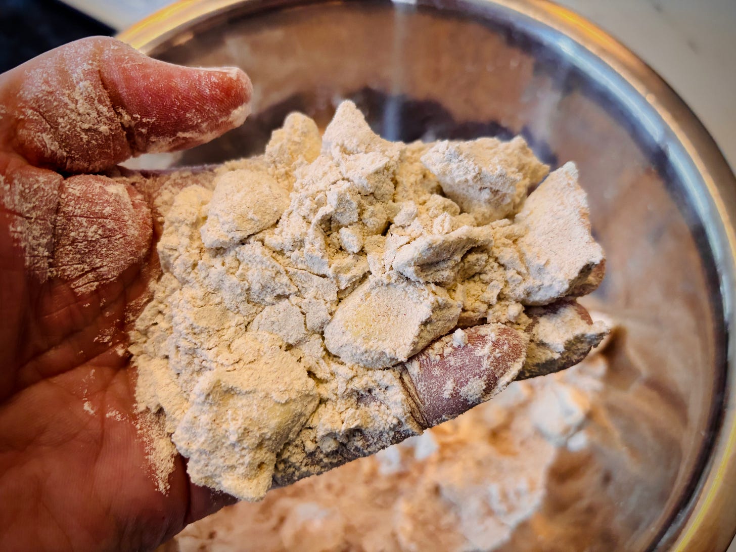 Stir everything together until the dough starts coming together, then use your hands to gather the dough into a more-or-less cohesive mass. Transfer the dough to the countertop and shape it into a rough rectangle. Note: The dough will smell really good at this point.