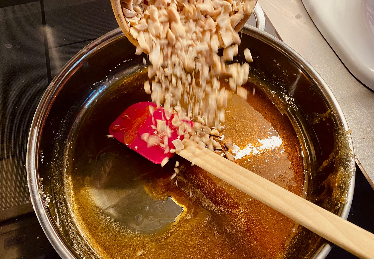 While I didn’t do it, adding the nuts while they’re still warm will give you a bit more leeway, but my kitchen was freezing cold; due to heat restrictions this winter, our apartment temperature is maxed to a brisk 19ºC/66ºF. But thanks to my working quickly, and blocking out any distractions (i.e.; a partner hovering when he smelled the caramel and peanuts cooking), mine came out just fine.