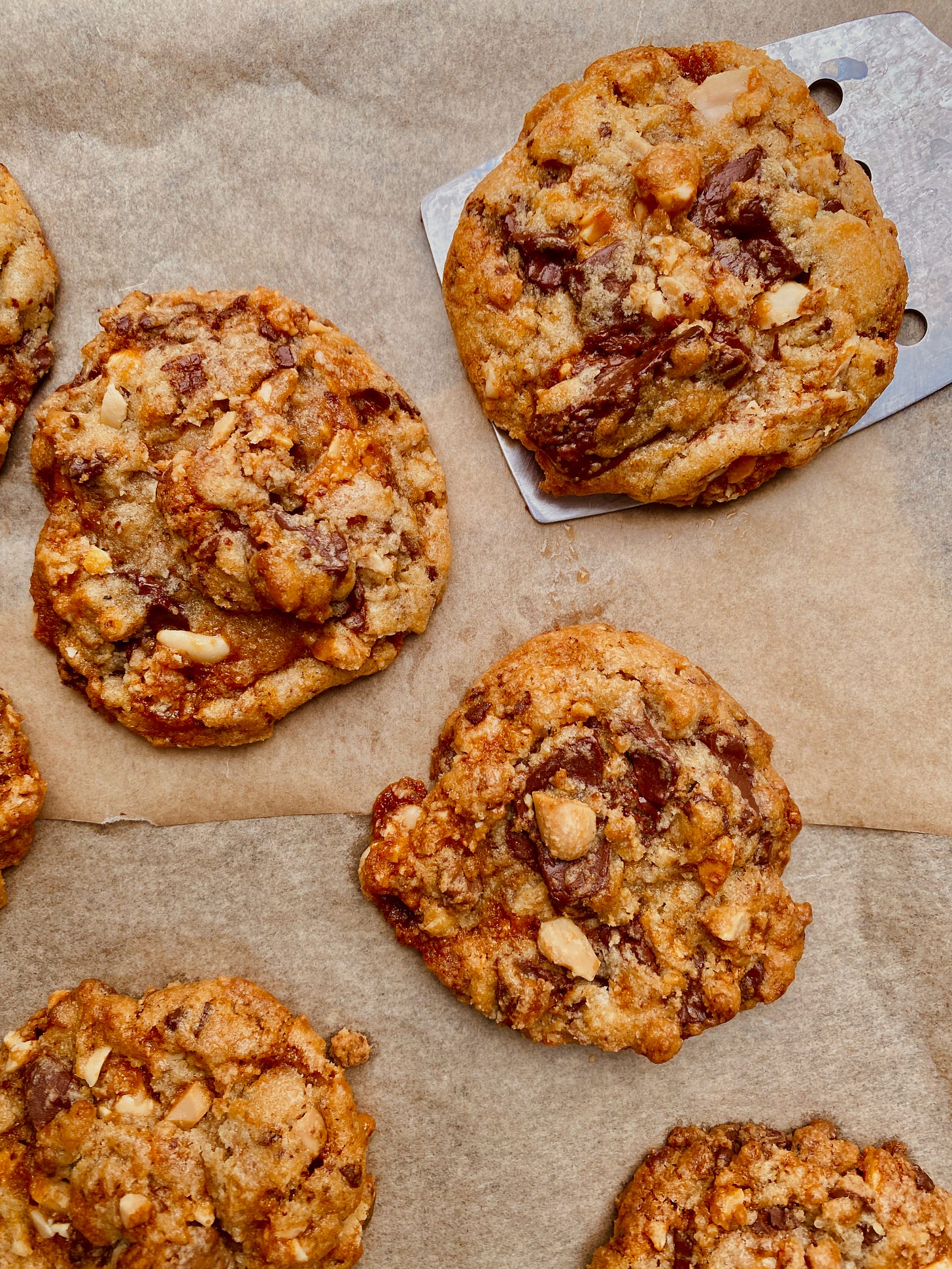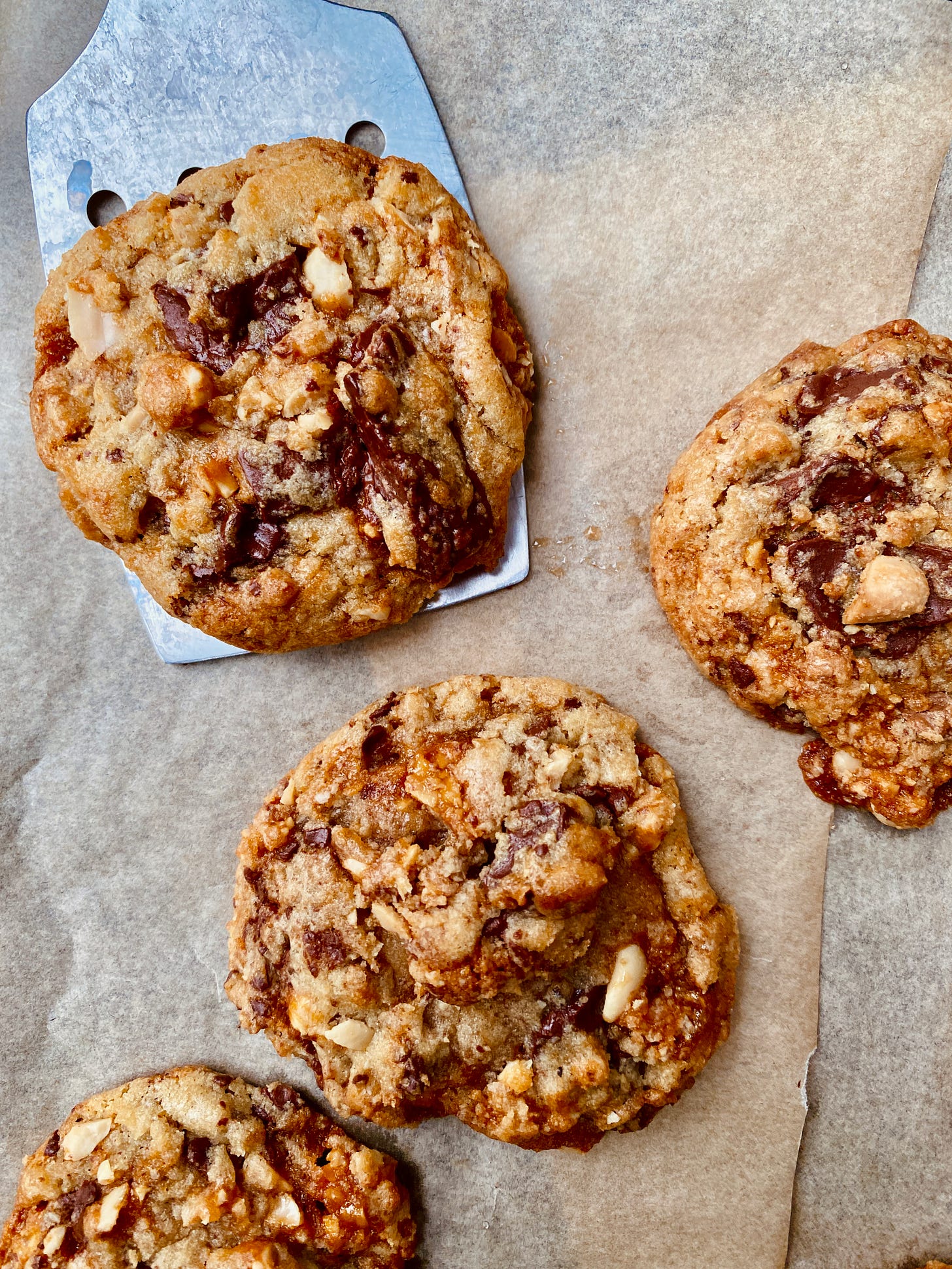 Although I didn’t do it, if you want neater cookies, you can roll them in your hands after scooping the dough into rounds just before baking. I liked the craggy look, with pockets of chunks of chocolate and caramelized peanuts.