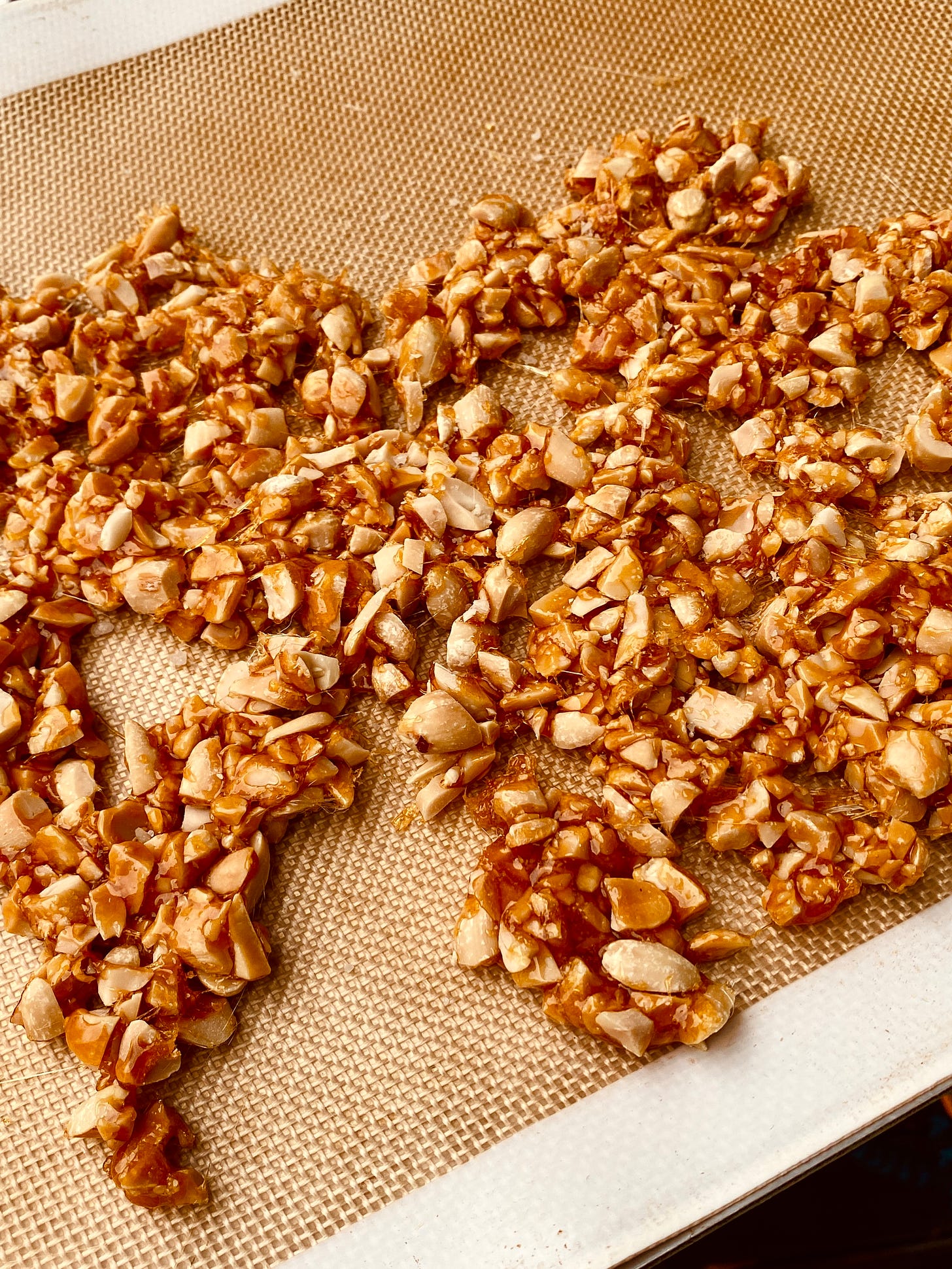 When you make the brittle, you’ll want to work kind of fast because once you add the nuts, things’ll tighten up quickly—you want to stir, coat, and spread ASAP. Try to get them as flat as you can when spreading them on the sheet pan. They may look like an irregular jumble, but I wouldn’t lose any sleep if they don’t look perfect.