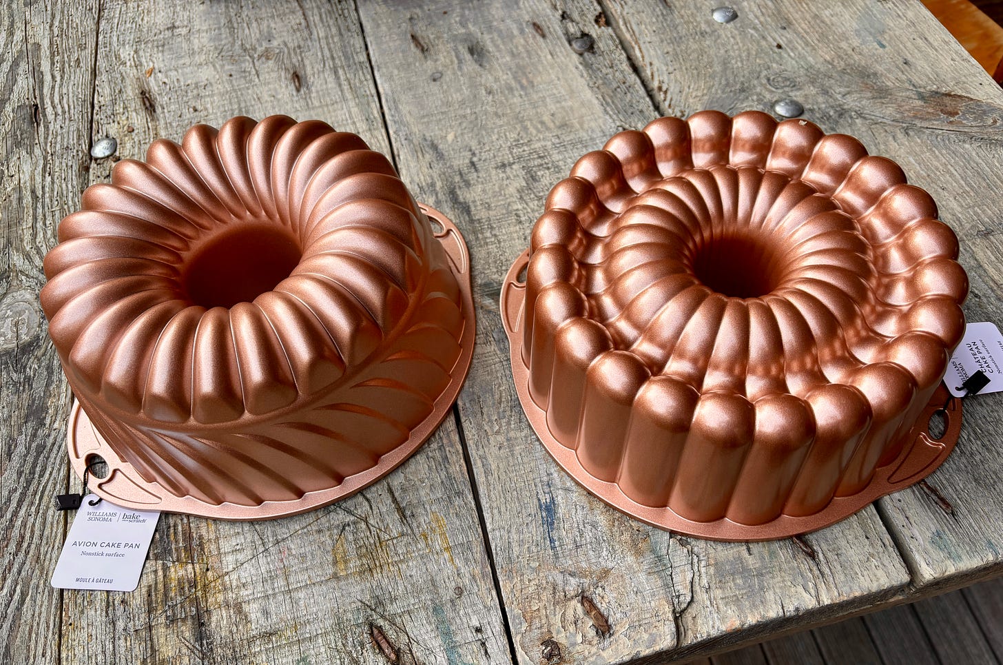 As a treat, Brian brought me two of the cake pans he designed for Williams-Sonoma, below, so I can start afresh with my shiny new fluted tube pans. And this time, I’ll treat them right!
