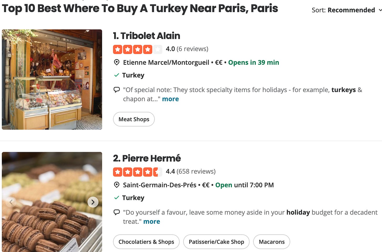 Thanksgiving is a holiday that’s traditional, of course, for Americans (Canadians have their own Thanksgiving), but French people don’t really “get” it. And to make the meal, you have to go on a scavenger hunt, tracking down all the fixings, like cranberries (nope, the airelles at Picard aren’t the same thing…let’s not pretend that they are), sweet potatoes (hold the marshmallows, at least for European guests), Pepperidge Farm stuffing mix, and whole turkeys, which you often have to pre-order, and if you live in an upscale neighborhood, they can cost a small fortune.