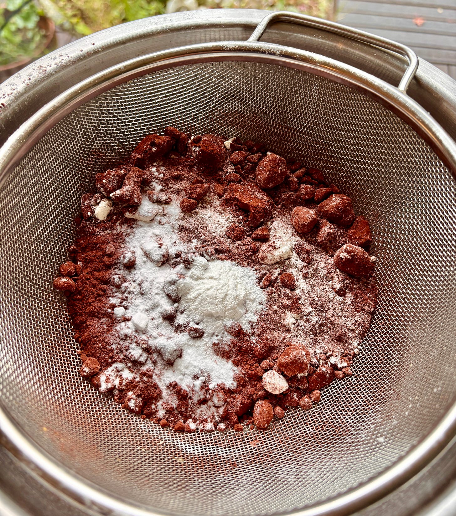 While Romain watched me gather the ingredients for making the cake, he wondered why I was putting the dry ingredients in a sieve. I told him it was to disperse them, especially the lumpy cocoa powder.
