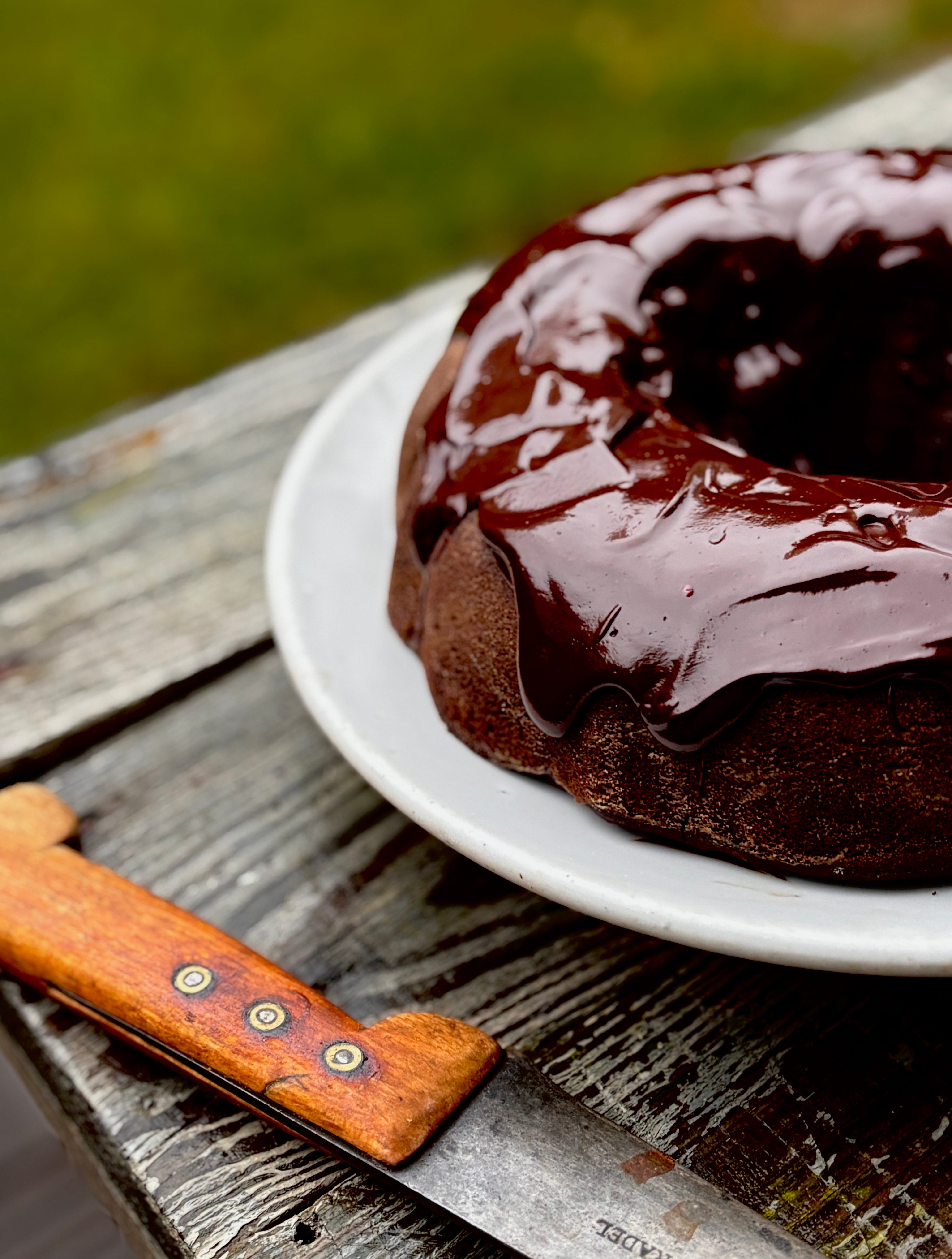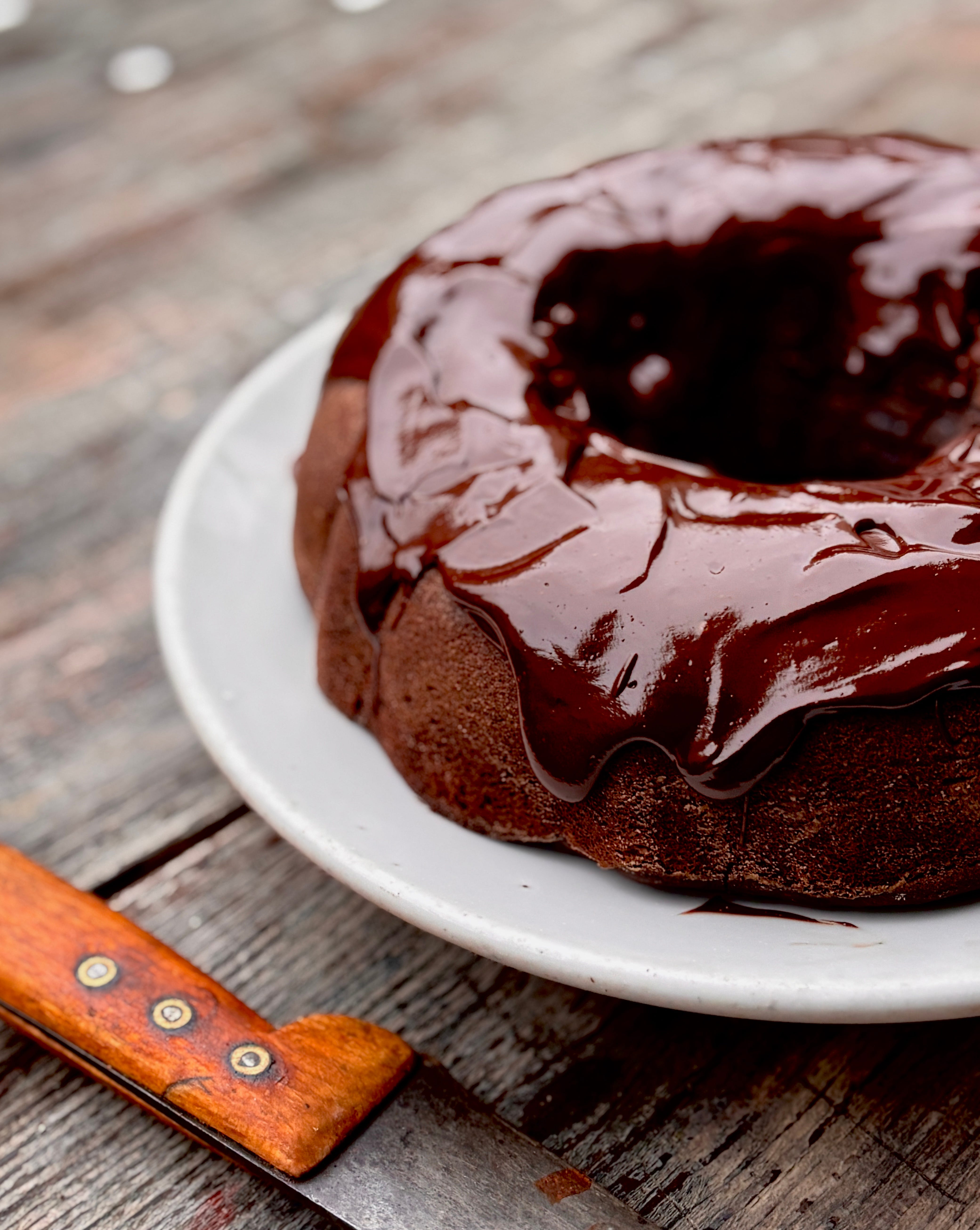 Dorie recommends topping the cake, after it’s glazed, with rosettes of whipped cream and either maraschino or amarena cherries, or chocolate sprinkles or shaved chocolate. I kept it squarely in the chocolate direction but if I wasn’t bringing the cake to a party, I’d serve it with ice cream.