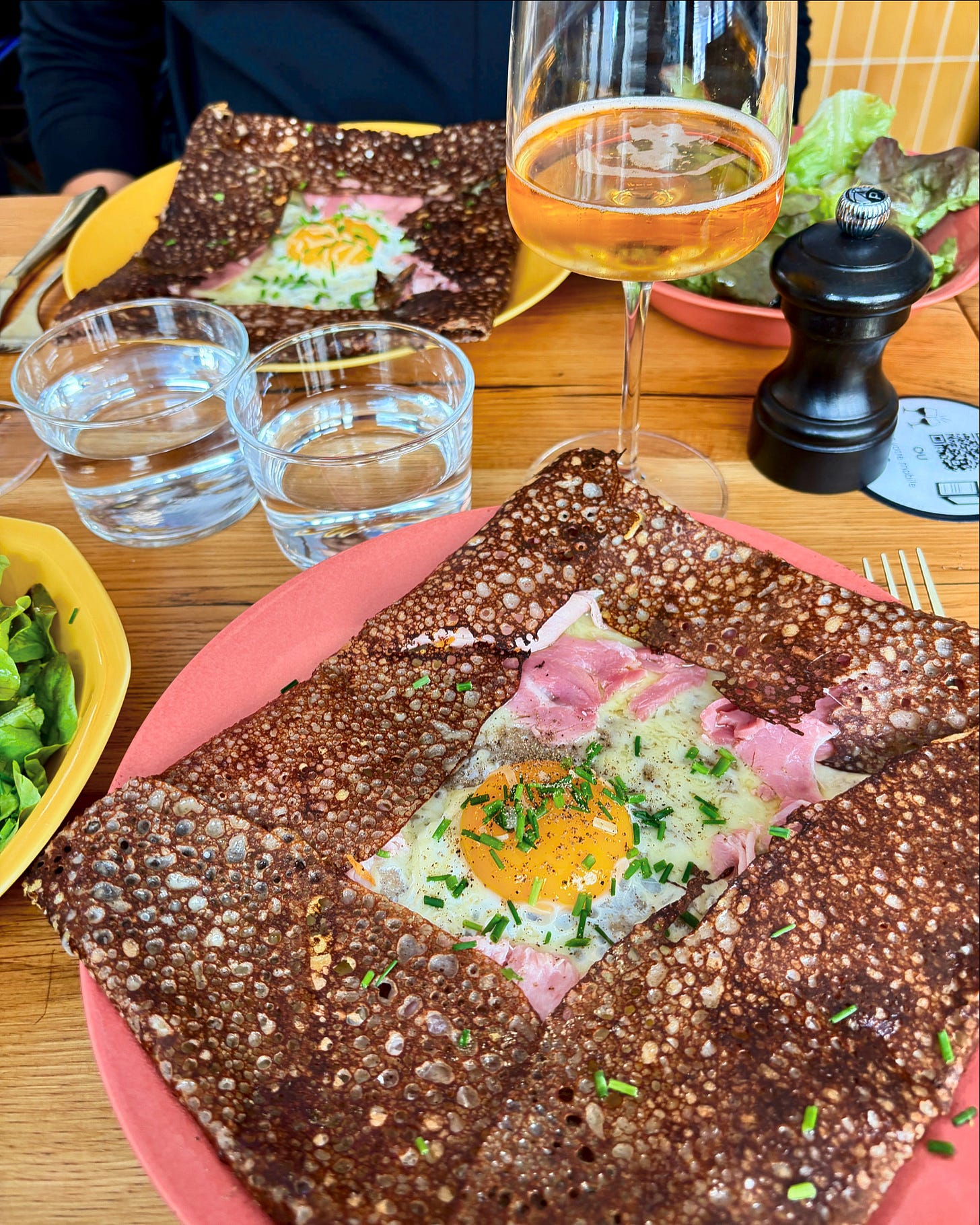 Before we moved last year, our neighborhood crêperie was Bernadette. I am always up for buckwheat galette (crêpe) and met a friend from New York here, who is a pastry chef, so I knew he’d appreciate a well-made crêpe. He followed my lead and also went for a complète, a buckwheat galette filled with ham, cheese and and a sunny-side up egg. Of course, glasses of sparkling cider are the obligatory accompaniment, although they have an excellent list of ciders from Brittany and Normandy. If you want a treat, try a bottle of Herout sparkling hard cider. (Although their non-alcoholic sparkling apple cider is also excellent.)