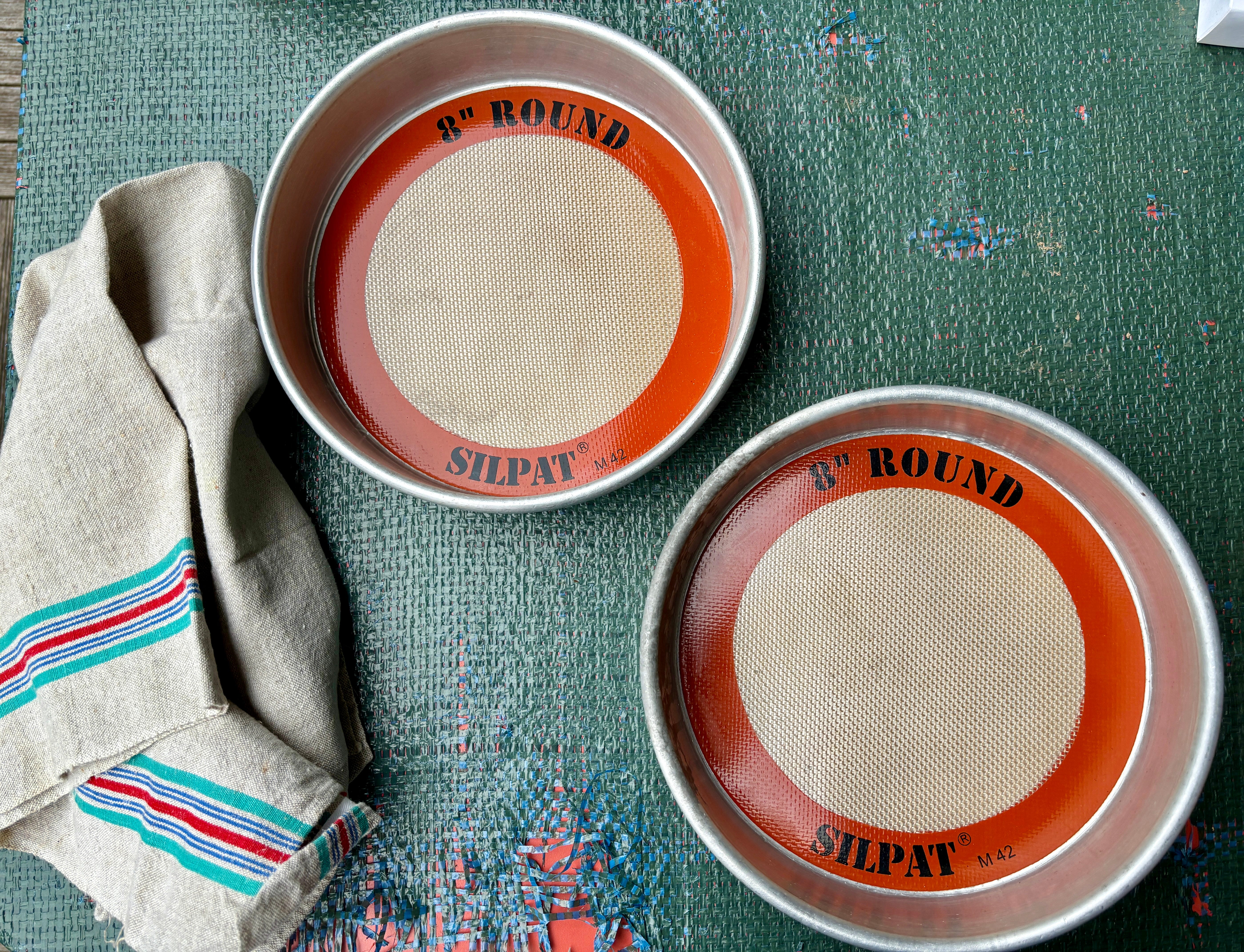 Figuring you can teach an old dog new tricks, I was excited to discover silicone round cake pan liners at a professional products show. They were still in development at the time, and I put my name on the list to get some when they came out. I dislike cutting parchment cake circles, and even though you can now buy those, silicone baking sheets imported from France were catching on in the U.S., and the cake pan liners sounded great to me. So even though the instructions for the cake said otherwise, I used my silicone cake pan lines, patting myself on the back for how wise I was.