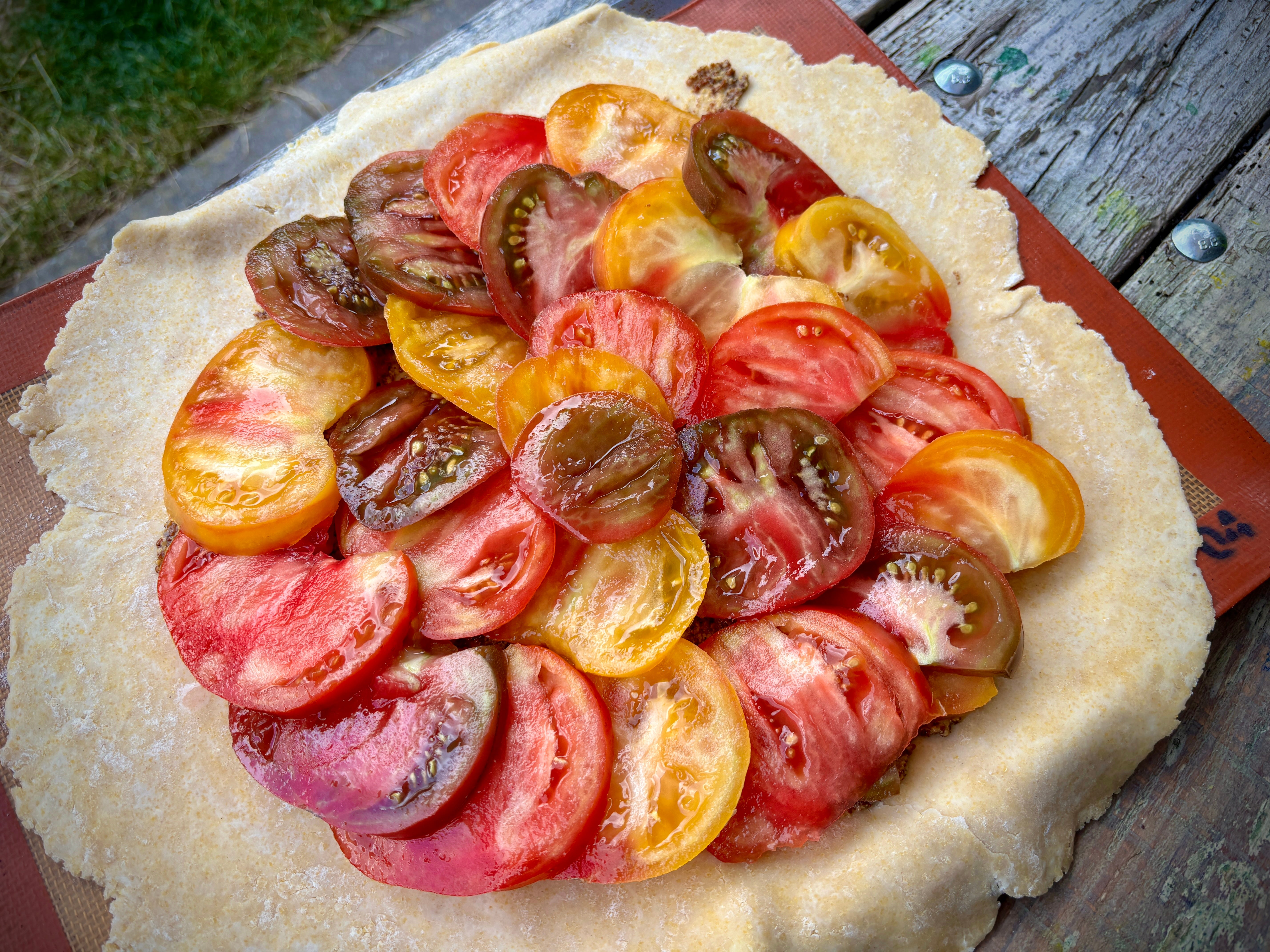 Slice the tomatoes about 1/3-inch (1cm) thick and layer them in concentric circles, overlapping them a little, over the mustard. Sprinkle the tomatoes with a little salt and freshly ground pepper. Fold the edges of the dough over the tomatoes to make an outer crust.