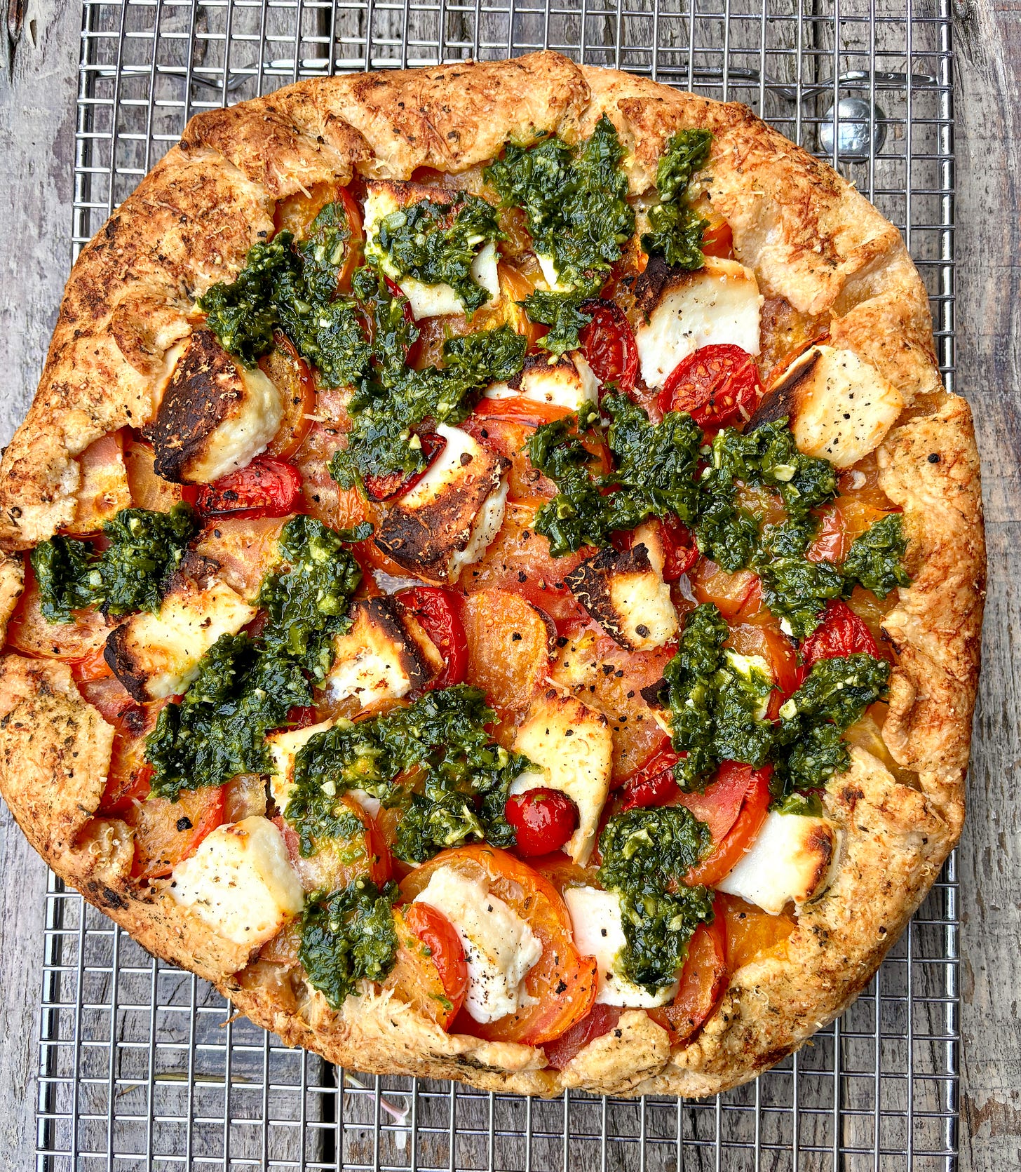 Bake until the tomatoes are soft and cooked through and the crust is dark golden brown, about 35-40 minutes. Slide the tart off the pan onto a wire rack and let cool for about ten minutes before serving.