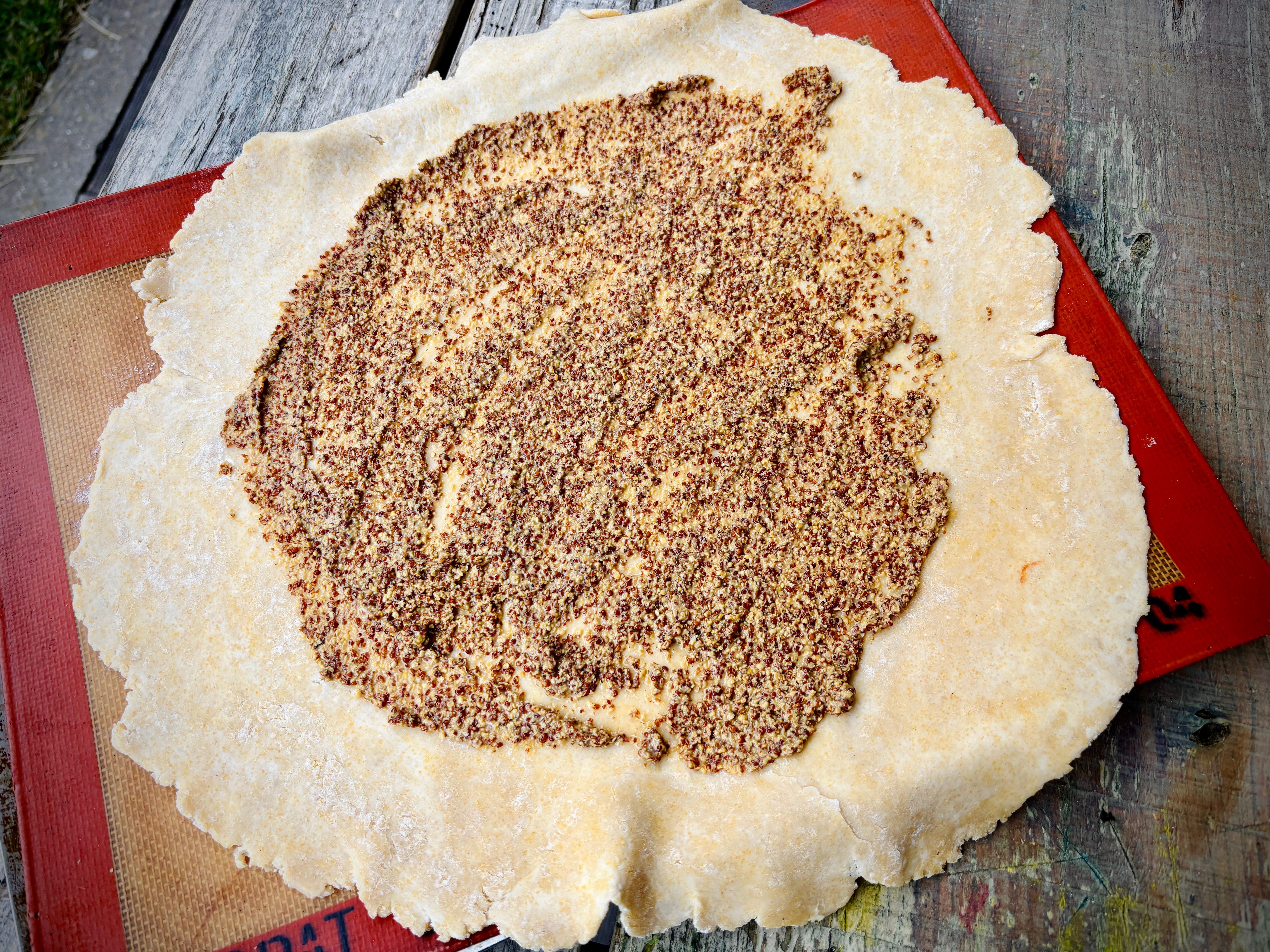 Spread a layer of mustard on the dough, leaving a few inches/centimeters empty around the perimeter, which you’ll fold over the filling later.
