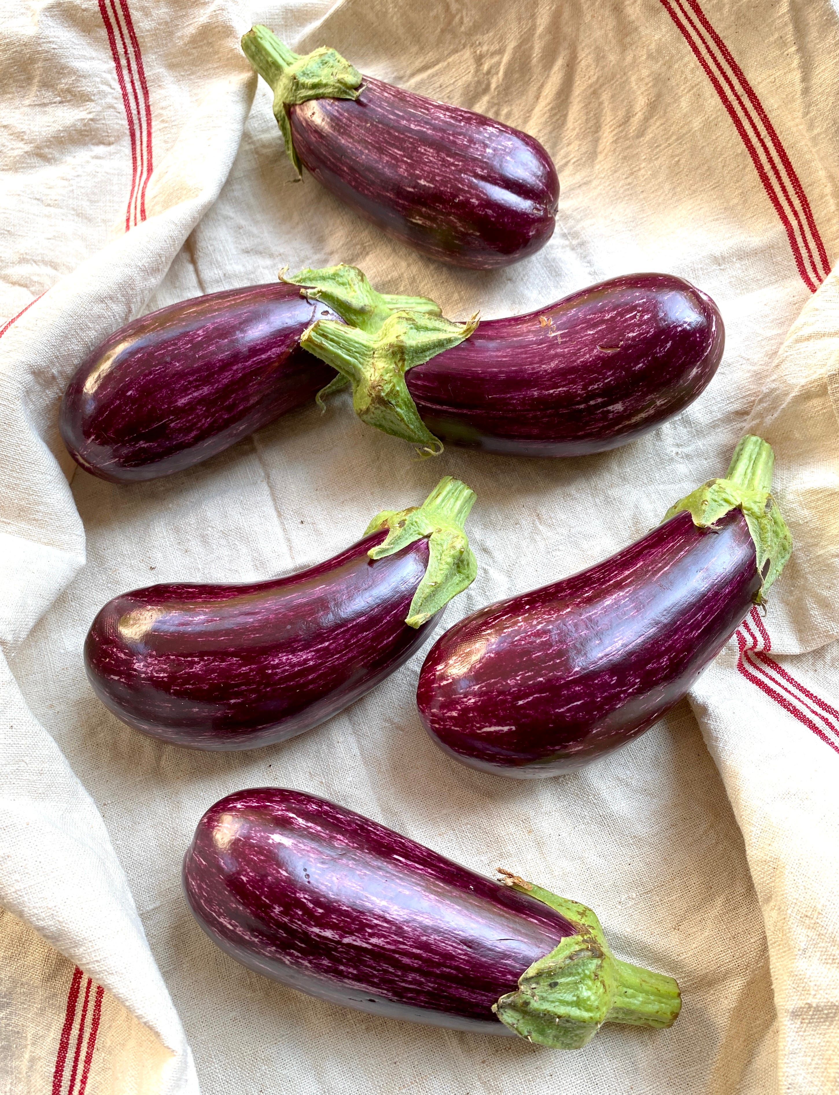 I’m pretty adept at using fruits but am not an especially creative cook when it comes to vegetables. Like fruit, the best thing to do with either is to present them as simply as possible, letting the fruits and vegetables themselves shine. If you’re going to add something to a plate, it should enhance, not hide, the main ingredient…especially when you have vegetables…er, I mean fruits**, such as these lovely little eggplants.