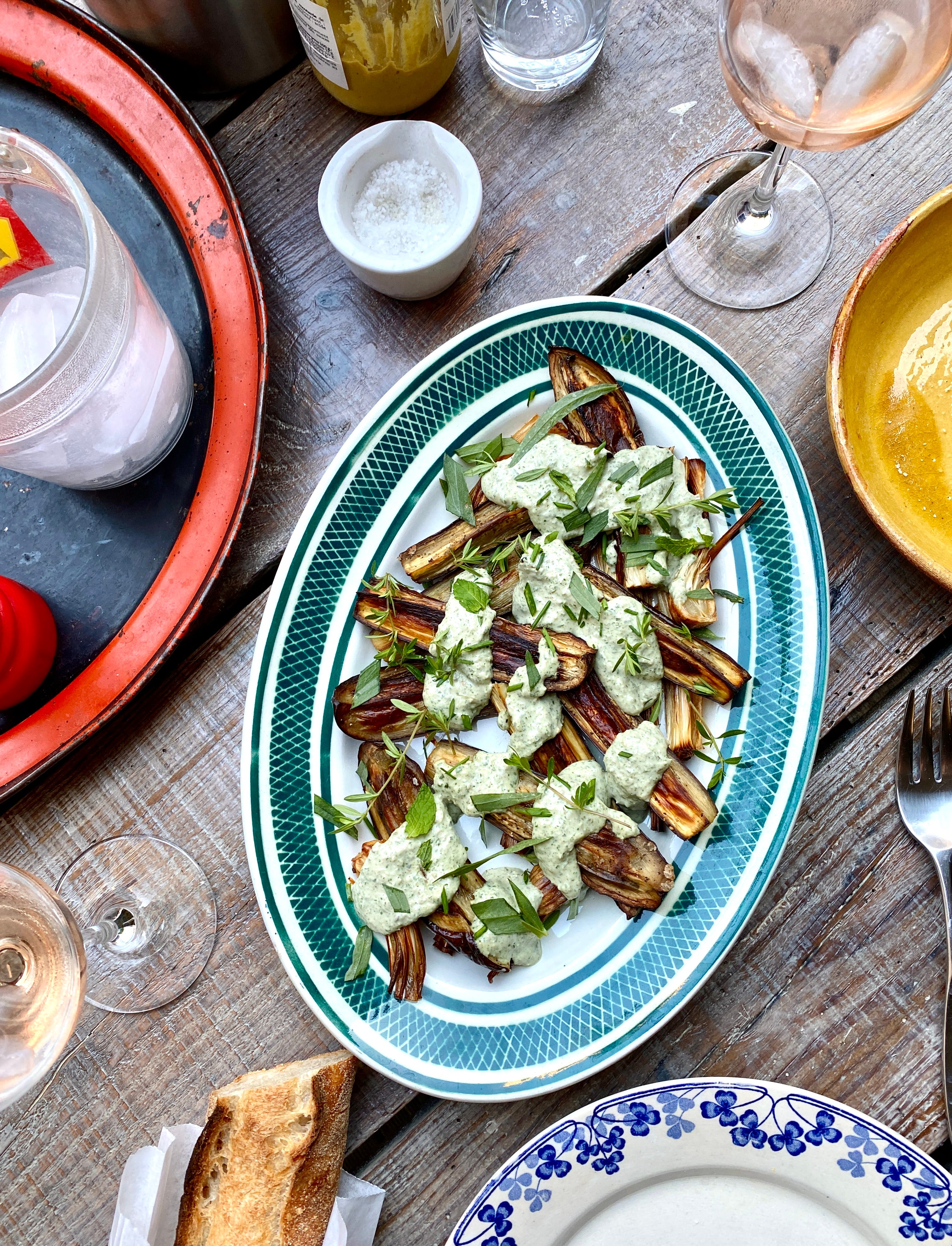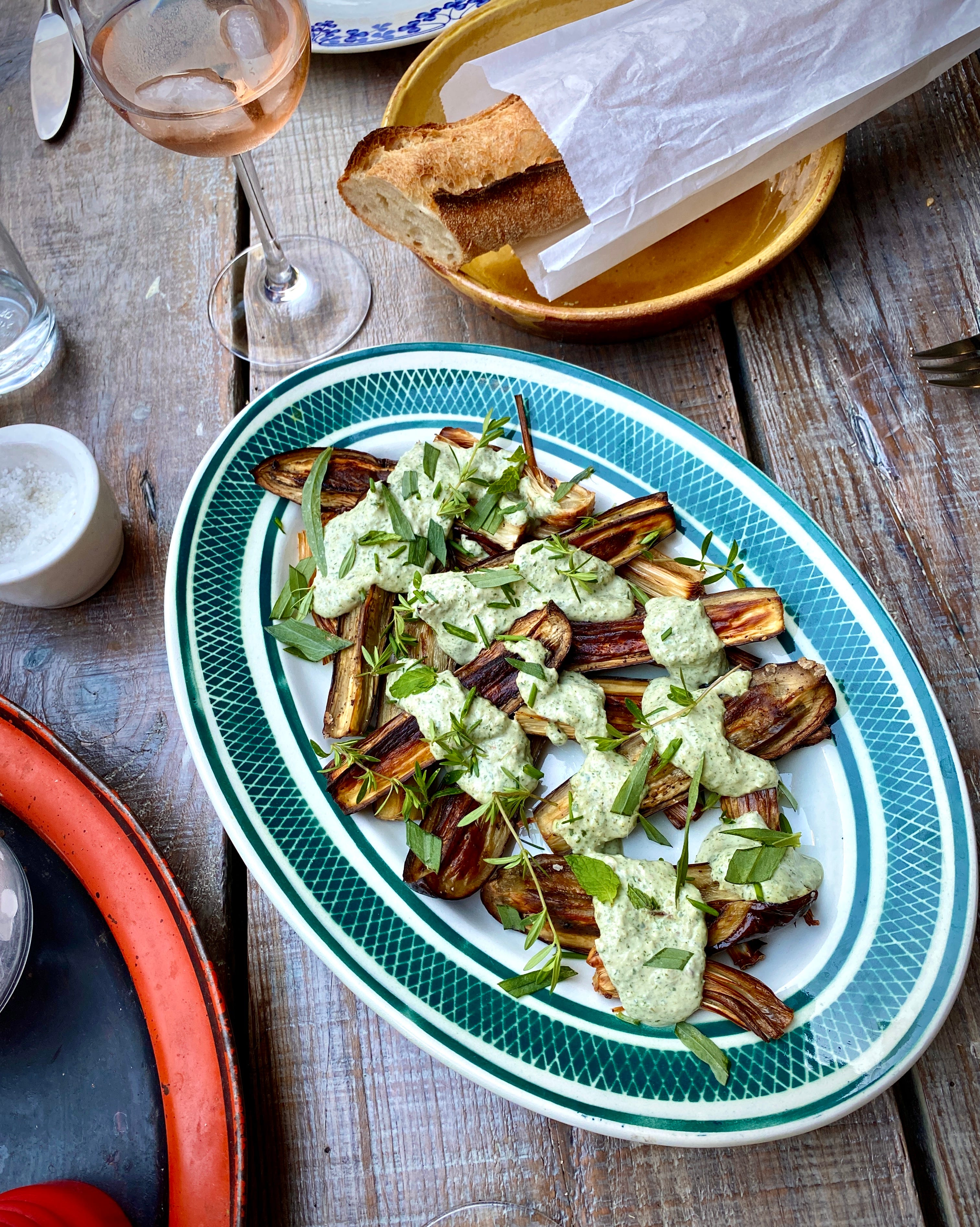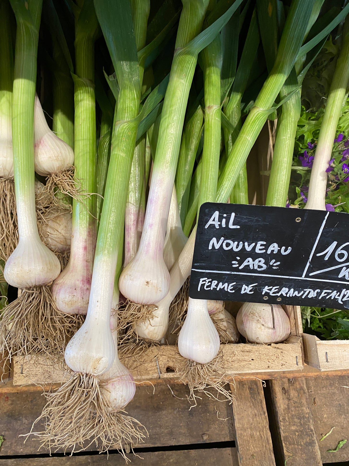 Sadly, the weather in Paris isn’t conducive to growing corn, because that smoked corn salad sounds good…but I do see it more and more at the markets and produce stores, although it’s not like the sweet corn in the States. Scallions also aren’t as prominent in French grocery stores as they are in the U.S. But we make up for that when all sorts of alliums appear in the spring, including ail nouveau, or new garlic, also known as spring garlic.