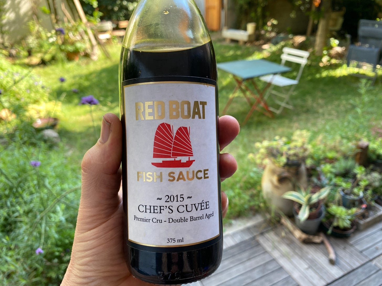 Since I’m giving shout-outs to brands, I also pulled out my bottle of Red Boat fish sauce, which I saw being made when I went to Vietnam. Romain and I tasted fresh mangoes with fish sauce salt, which was a revelation, but as they advise, a little fish sauce goes a looong way.