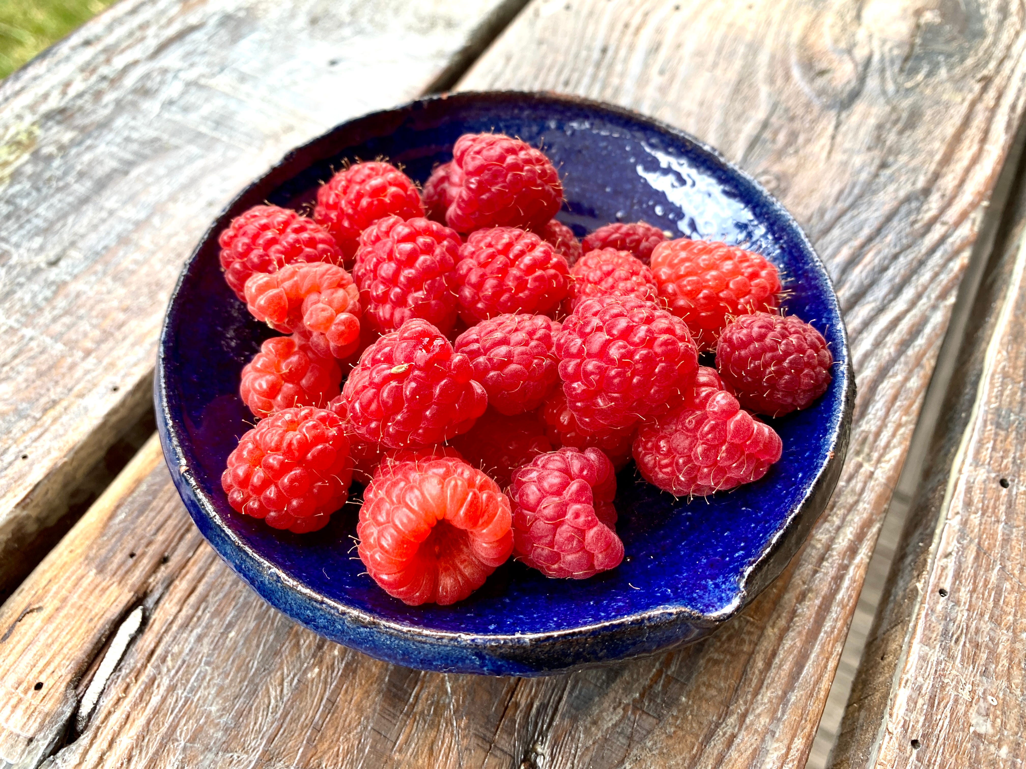 No one is happier than I am that we managed to outwit the birds this year, putting netting over the raspberries — which has ‘netted’ us fresh berries every morning*. I’d like to say I’m going to have enough one day for a batch of raspberry sorbet or a few jars of jam, but when the raspberries are this good, it’s hard to do anything else to them but eat them.