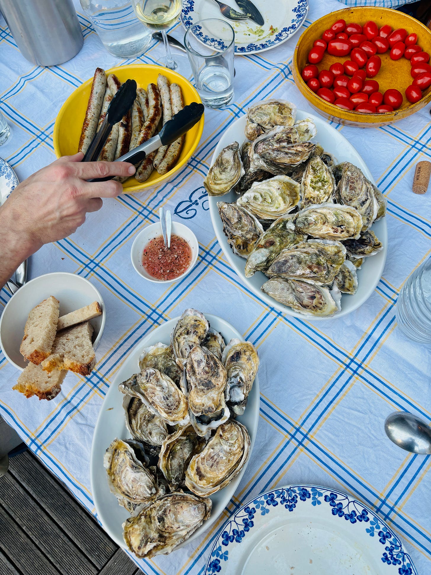 Thankfully, the rules about “months with an R” for eating oysters are mostly malarky. A great way to make oysters a meal is to add warm sausages, and wine, of course. (It’s also classic to serve oysters with rye bread and salted butter, but as you can see, I made guacamole, which was for the apéro.) The sausages are a custom from Bordeaux and the warm, gently spiced, fatty sausages are a surprisingly good combination with the briny oysters.