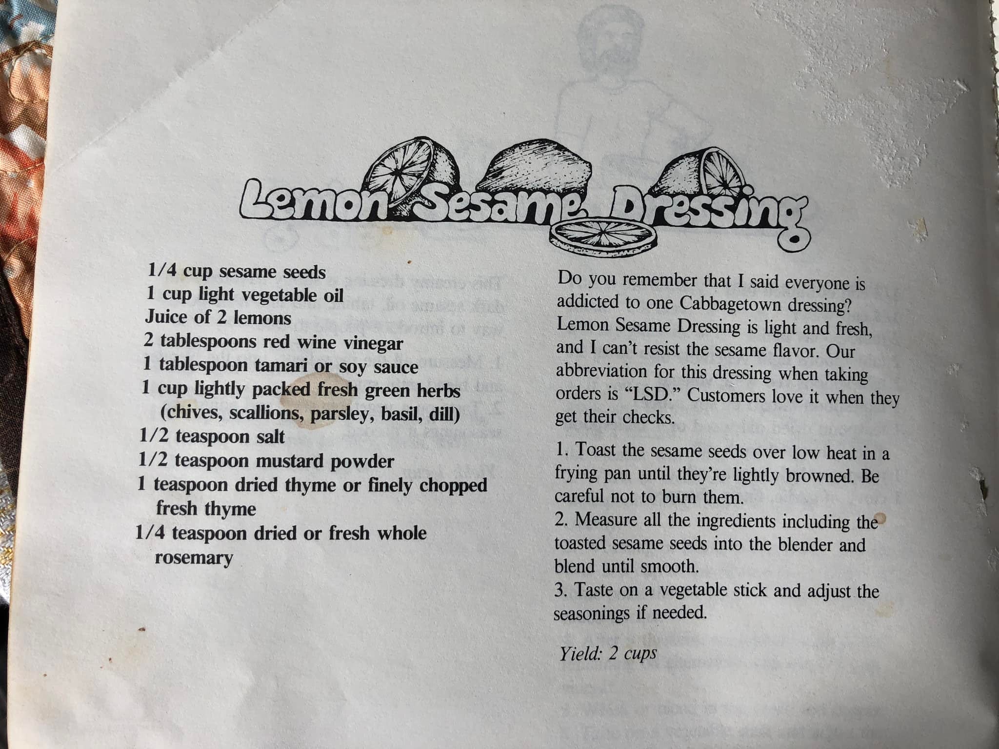 I met up at the Finger Lakes Cider House with friends I worked with at the legendary, now closed, Cabbagetown Café. In many ways Cabbagetown was waaay ahead of its time; we bought only local vegetables from farmers, our apples came from the nearby orchards of Cornell University’s agriculture school (as did our dairy products), and we sold wines from the Finger Lakes region. This was back in the 80s, before the term “farm-to-table” existed. We also made our own bread every morning, served strong, good-quality coffee (before Americans had Moccamasters and shops sold specialty coffee for $6 to $8 a cup), and many people fondly remember our salads served in handmade wooden bowls (made by a local woodworker), which could be dressed with what was nicknamed LSD (Lemon Sesame Dressing), or Sesame Tofu Dressing (which, for better or worse, was shortened to STD), or Creamy Garlic, a prescient riff on Aïoli.