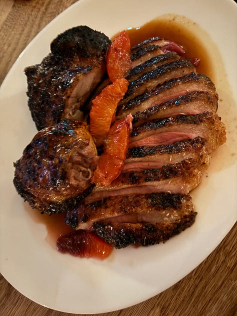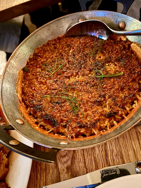 I couldn’t convince my dining companion, who has extensive dining experience and has dined around the world, to order the wood pigeon with me, so we shared the roast duck instead with blood oranges and plums. Every table seemed to have the wood-fired rice on it (above center), which was good, but I would have liked just a bit more moist rice under the ultra-crunchy topping for contrast, like tahdig.