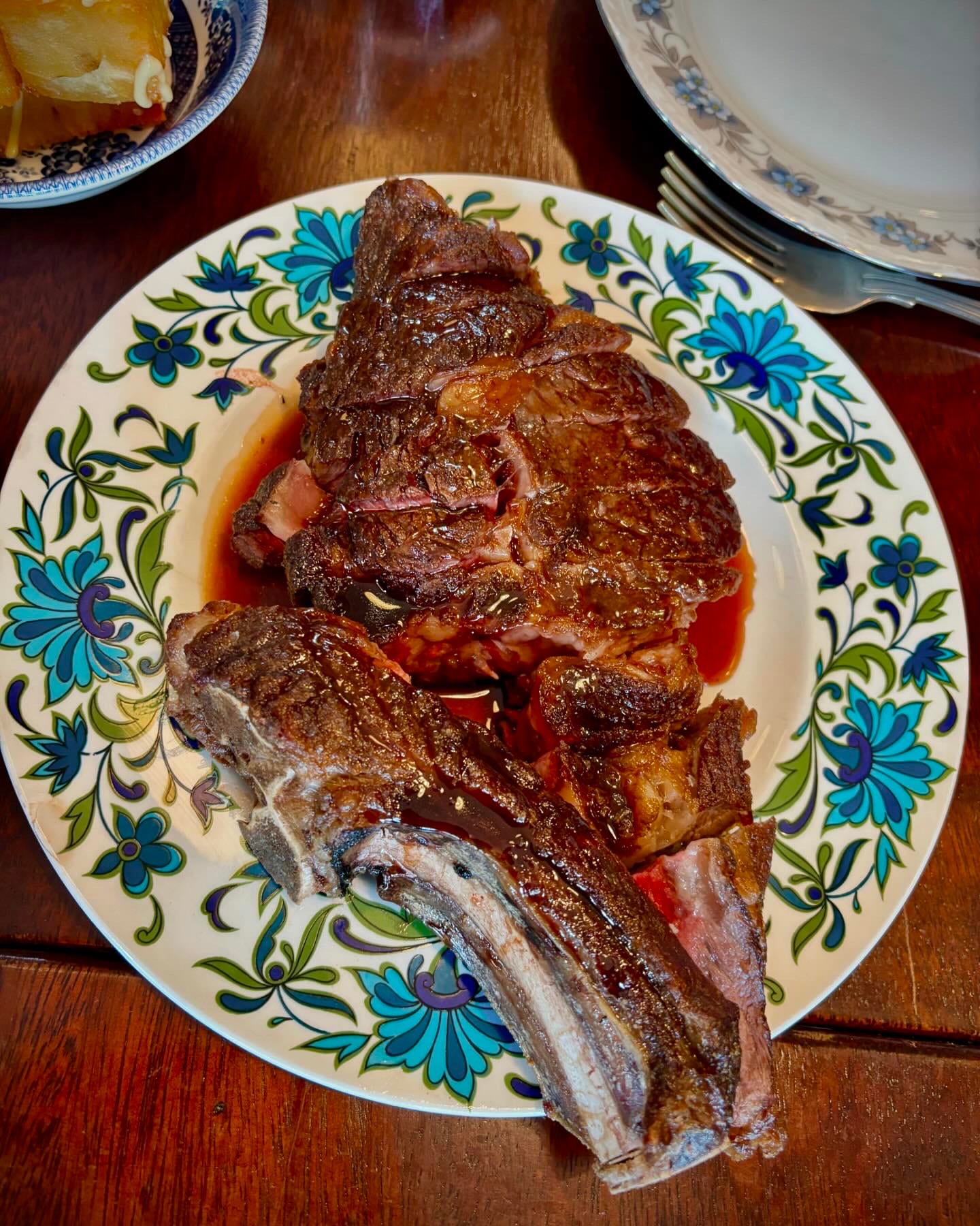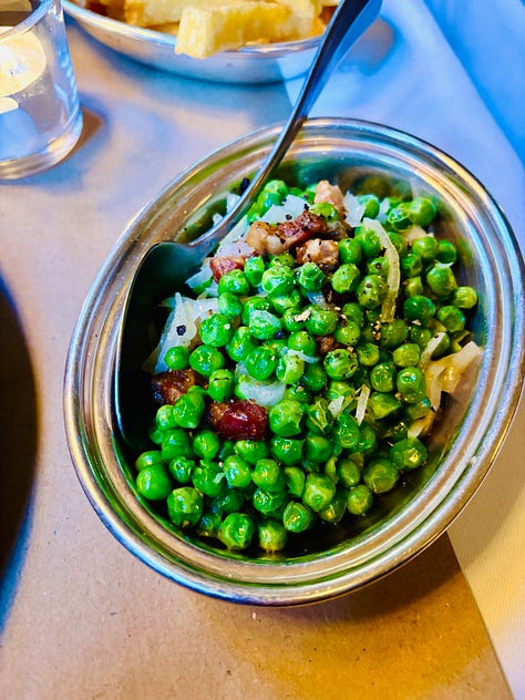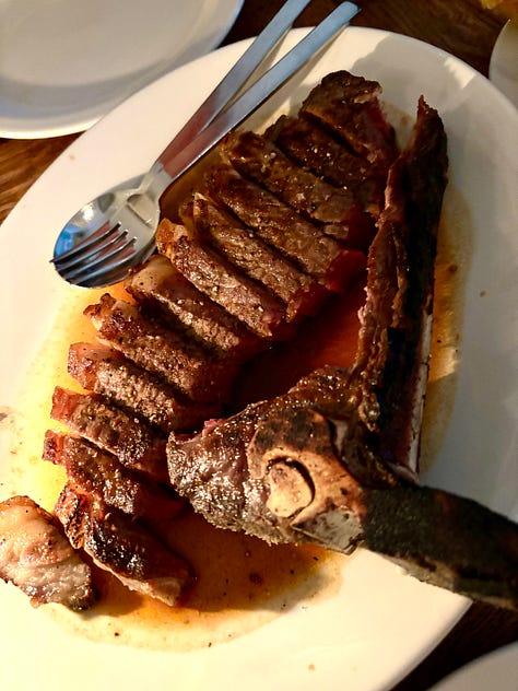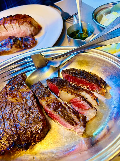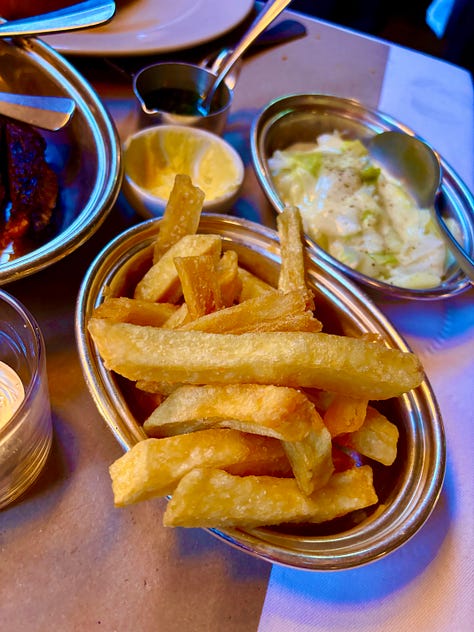 We shared a bone-in ribeye between the three of us and that was plenty, although I would have eaten more if we weren’t having dinner in a few hours. The beef was aged so was extra-tender, and it was truly one of the best pieces of meat I’ve eaten in years. (The beef in France can be rather tough and is often served bleu, extremely rare, so it takes a bit of muscle, and a good knife, to get through it.) We don’t eat a lot of beef at home, so it was nice to indulge in good British beef.