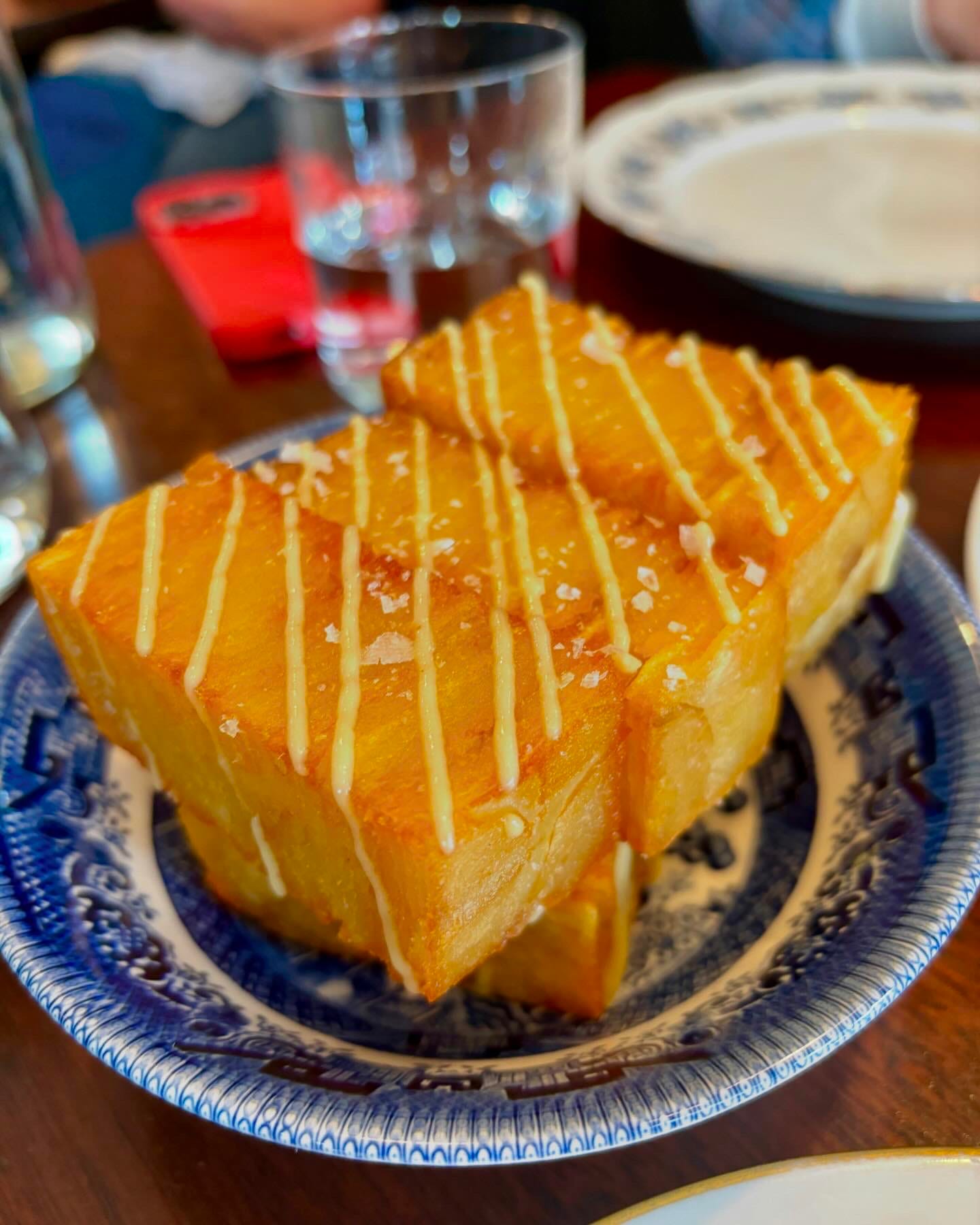 The famed confit potatoes were certainly a standout, and while we were trying to figure out how to make them—each block is miraculously composed of a series of paper-thin potato squares pressed together and later fried—a quick online look at the recipe in The Guardian revealed that the initial cooking of the potatoes and duck fat involves a three-hour period in the oven, which is just for the potatoes to get cooked. Then they’re weighed down overnight and fried the next day—I decided it was worth a trip back to London if I wanted to have them again, rather than make them at home.
