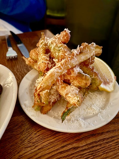 We loved the flatbread, and the spicy oil, and liked the veal tartare with capers and anchovy dressing, which was a little overshadowed by the zesty flatbread we wolfed down just before. We considered sharing a pasta but instead went right for the sirloin steak on the bone, along with a pile of crispy zucchini fries.