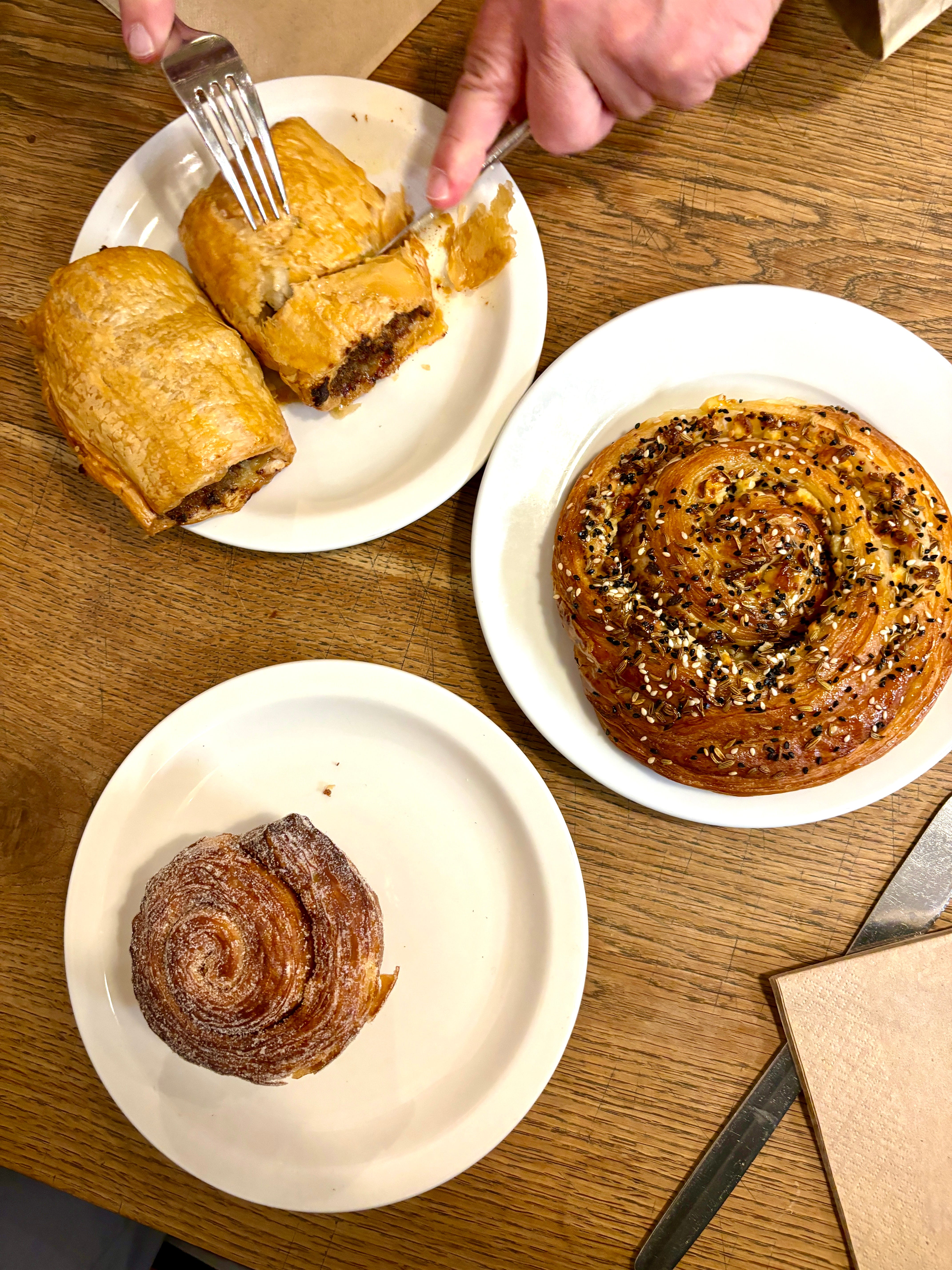 One of my friends isn’t into sweets—quelle horreur!—but he happily ate two sausage rolls. Since I was in charge of ordering, I added a sugar-crusted morning bun and a feta and honey swirl to our order, which was one of the best pastries I’ve had. The crusty spiral (above, right) was showered with what turned out to be mostly sharp-tasting black onion seeds, along with sesame seeds, and filled with feta. I’m not a big fan of very sweet morning pastries, so it hit all the right sweet-salty-savory notes for me.