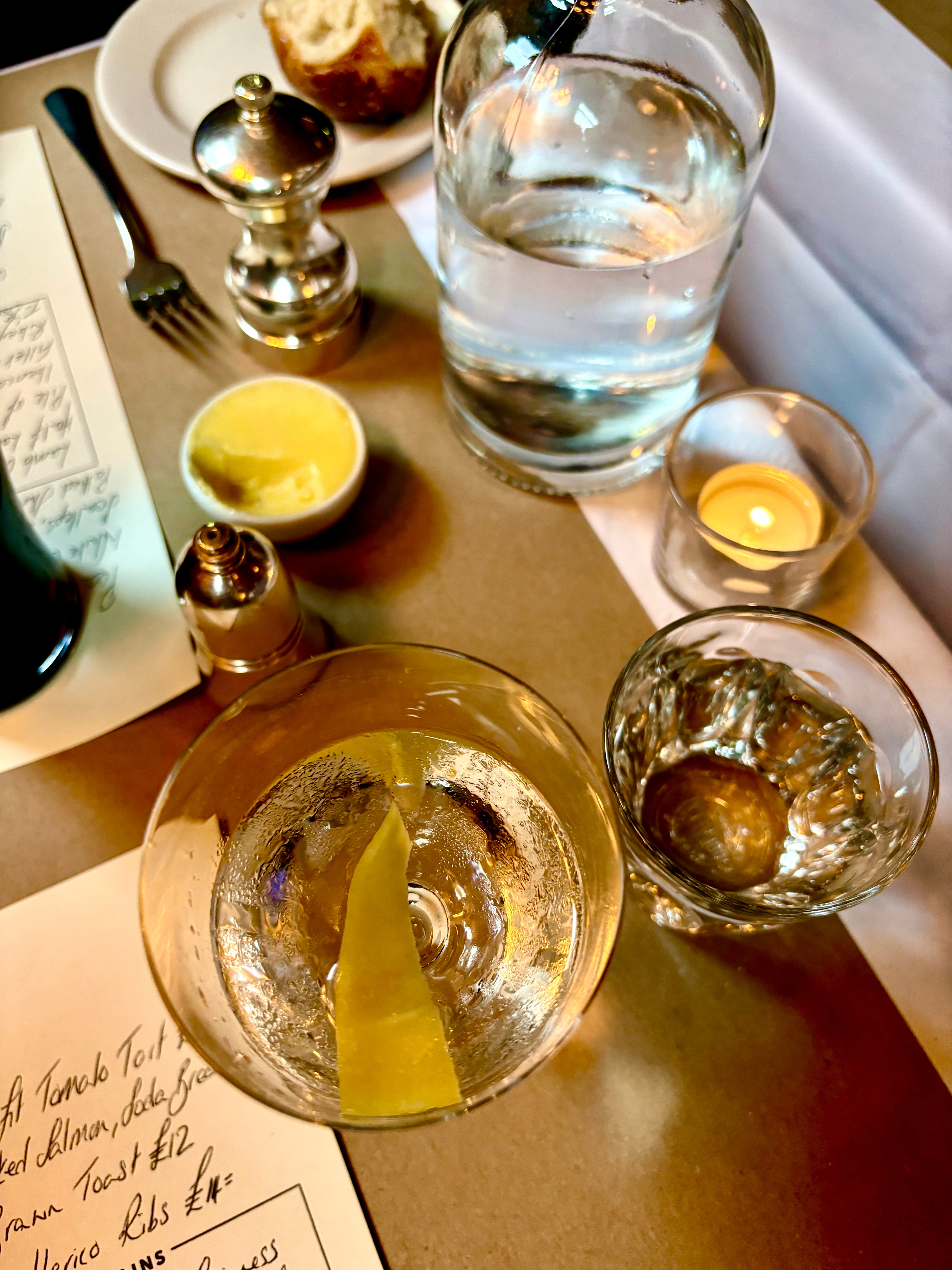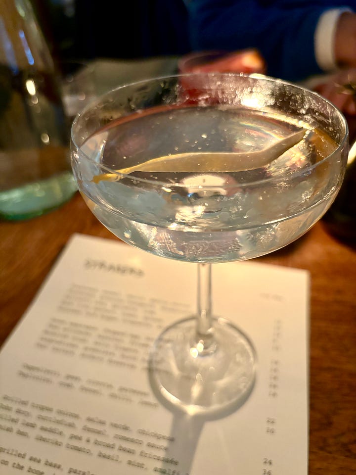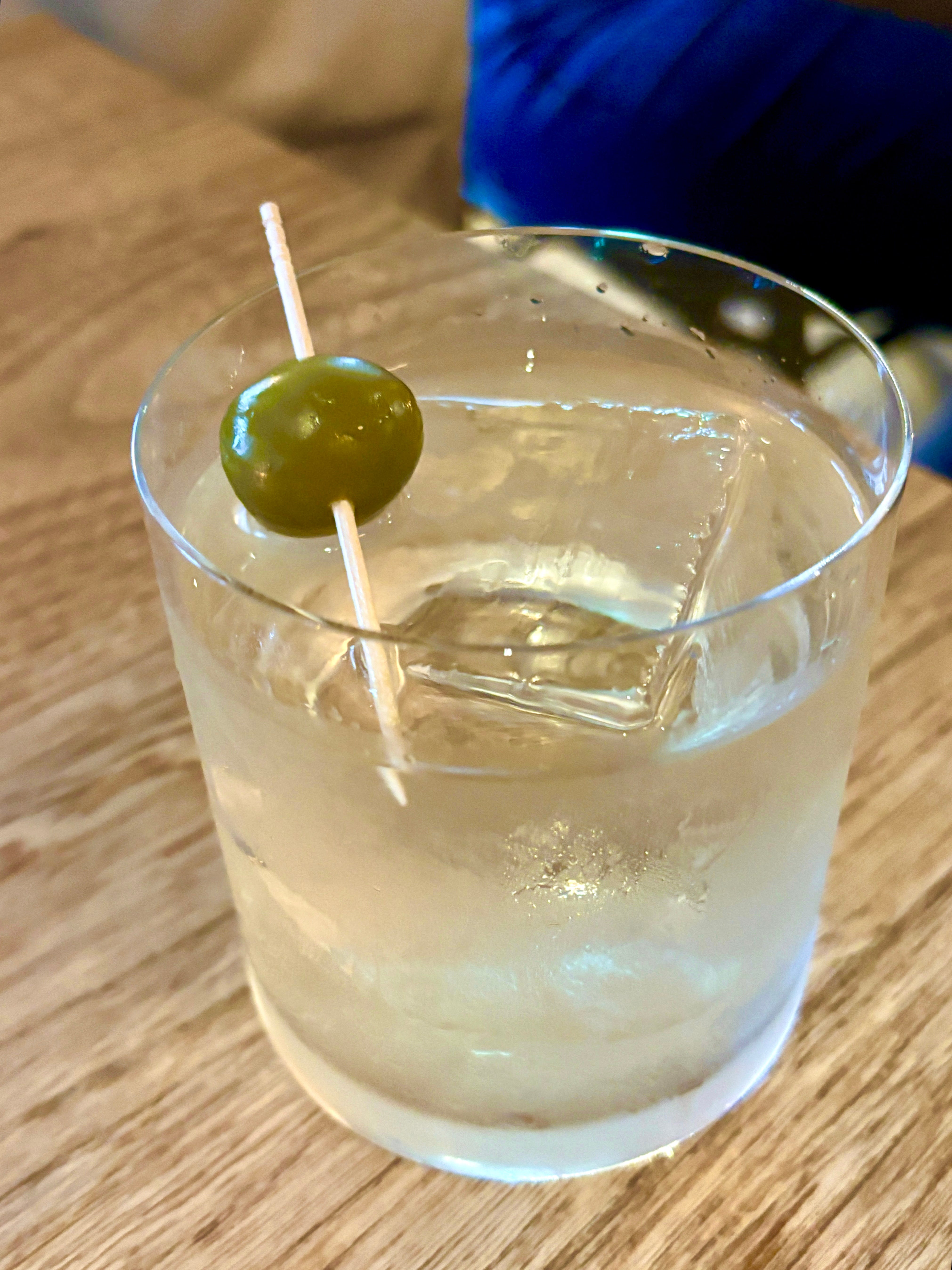 I started with the house Martini, above, which (from what I could hear about it…) was made with both gin and vodka, a Minorcan (or Majorcan?) herbal liqueur, vermouth, and olive brine. For those scratching their head over an ice cube in a Martini, some Martinis are indeed served over ice. Either way, it was a very good cocktail.