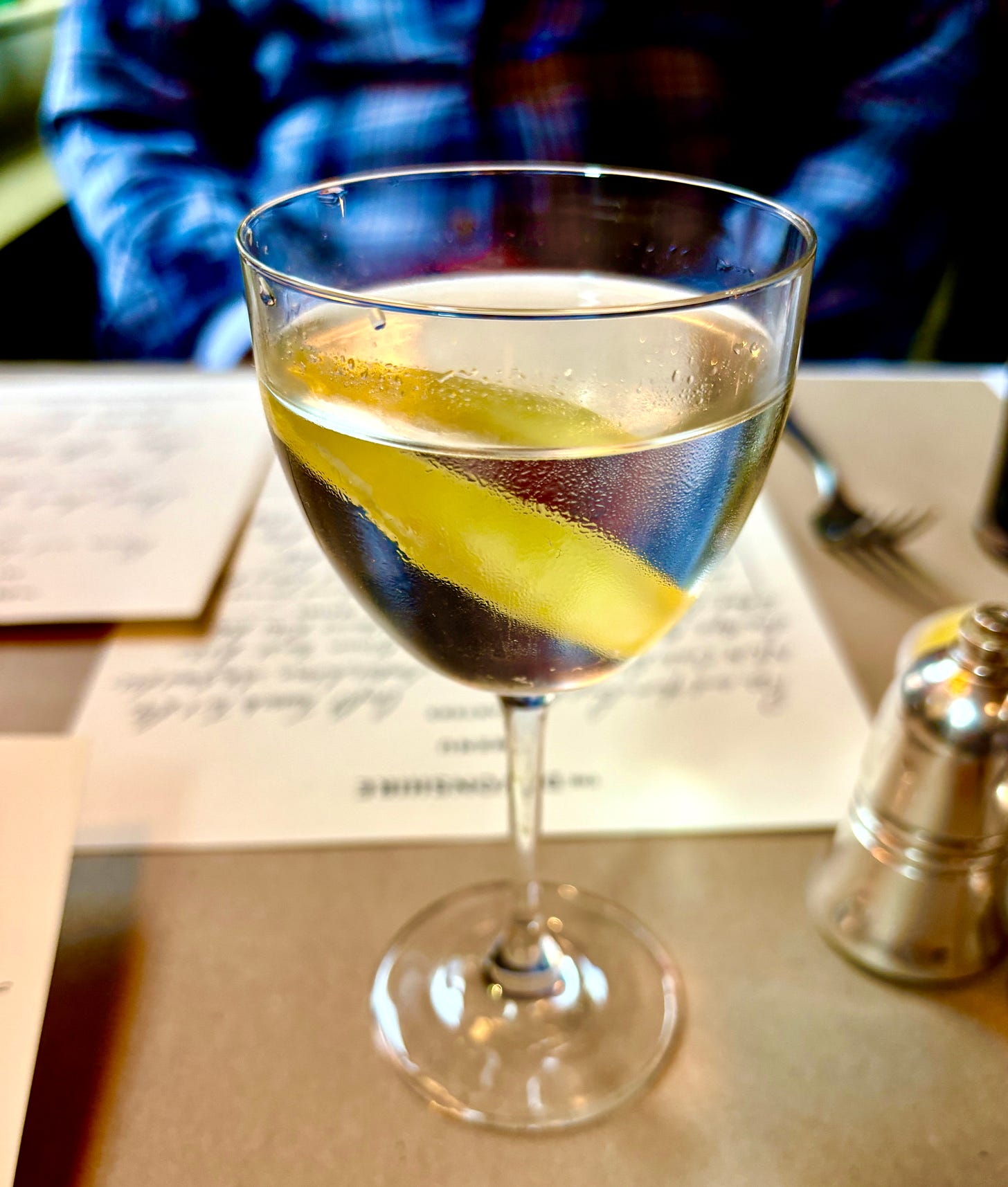 Located a short walk from the Portobello Road Market is Straker’s. Since it was our last dinner in town, I wanted my last London Martini, and this one was good, made with Noilly Prat vermouth, a bit of orange-based French apéritif liqueur and a touch of bergamot. Just as I was taking my first sip, one of the owners came over to introduce himself, saying he’d brought Drinking French with him on his trip to France and discovered some liqueurs and apéritifs that were new to him. It’s always nice to hear from the people in the spirits world since part of the reason I wrote the book was to introduce people to French liqueurs and liquors that they might not know about. And it’s gratifying that some of them are also enjoying, and learning something from, the book, as I did when I was writing it.