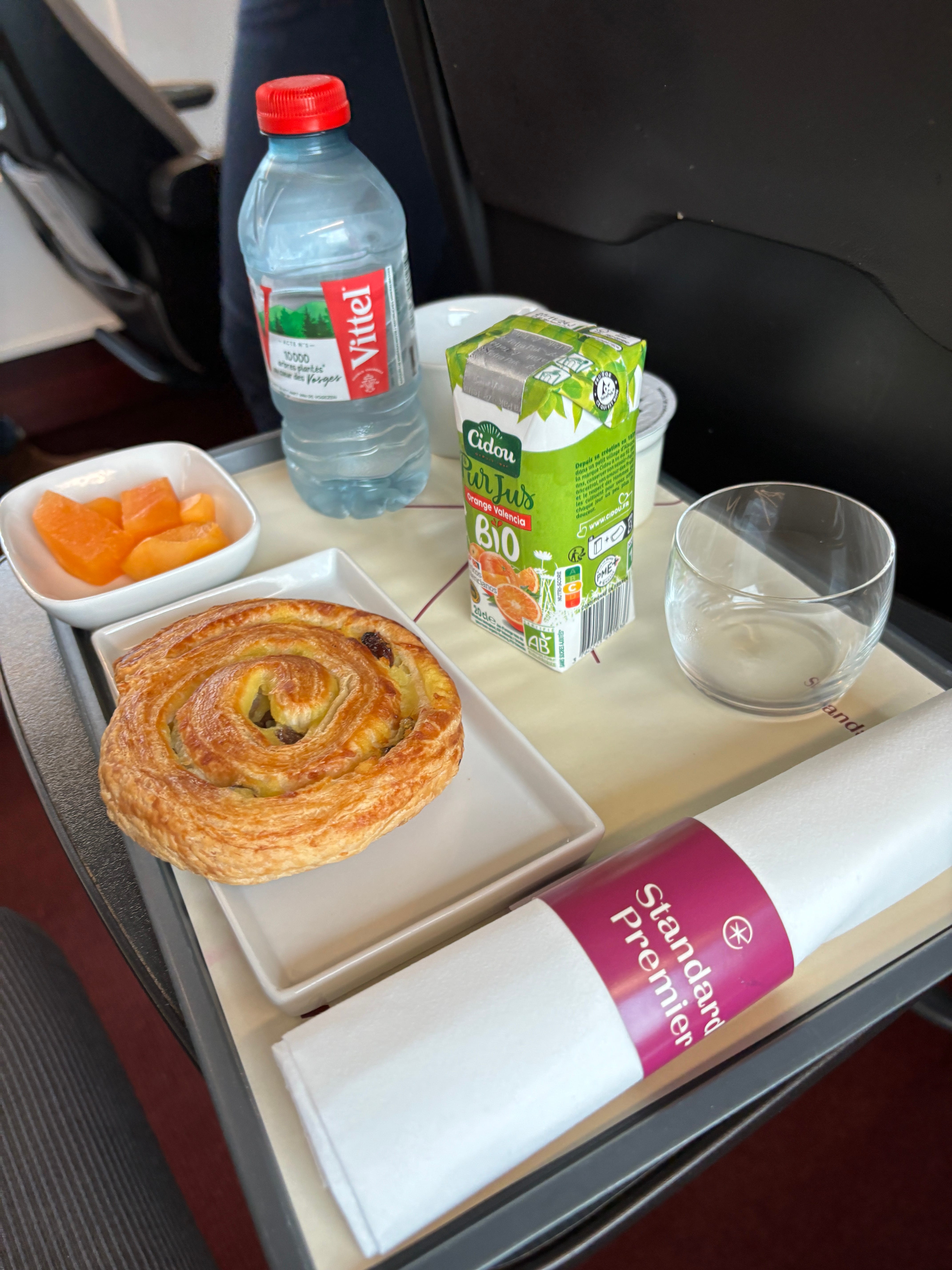 Since I booked a few months in advance, I only paid a little extra to go Standard Premier, which included what they call a snack but seemed to me to be basically a meal. The breakfast, above, wasn’t too glamorous (on the way back, there was a salmon salad or a vegetable plate — plus wine), but I’d already eaten so was mostly in it for the coffee, which came by moments later.