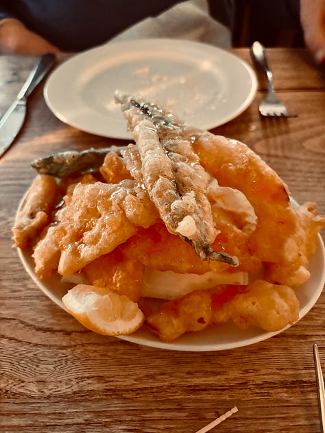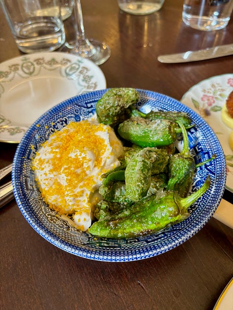 We started with an excellent smoked ham hock and chicken terrine with curry mayo. We loved the other starter, smoked cod roe with Padrón peppers, which didn’t seem to go with each other, but they were both so good we didn’t mind. Especially delicious were the pork shoulder croquettes with English mustard mayo, super crispy on the outside, with shredded, tender pork meat inside. Although the order was only two, they gave us an extra one, so the three of us could each have our own.