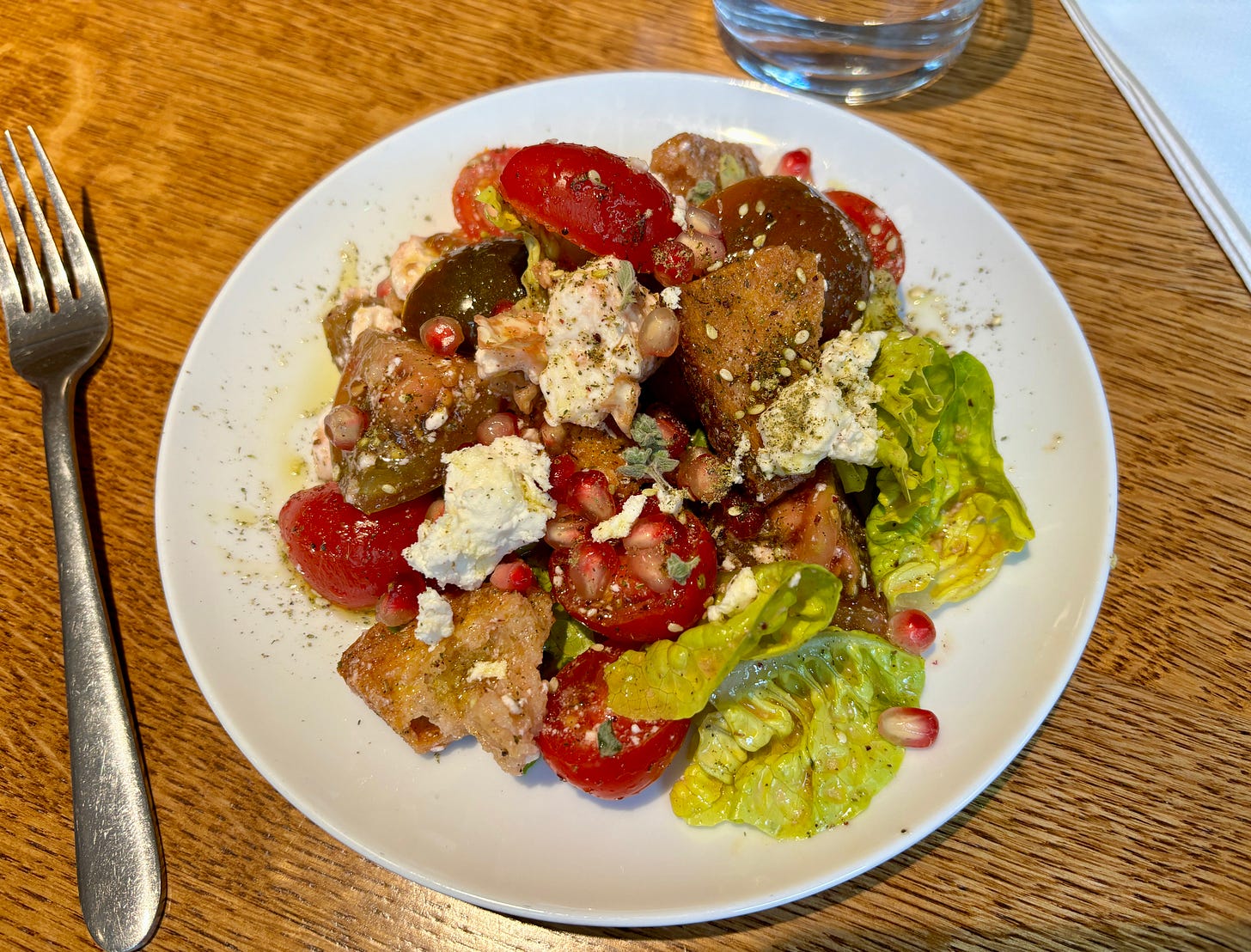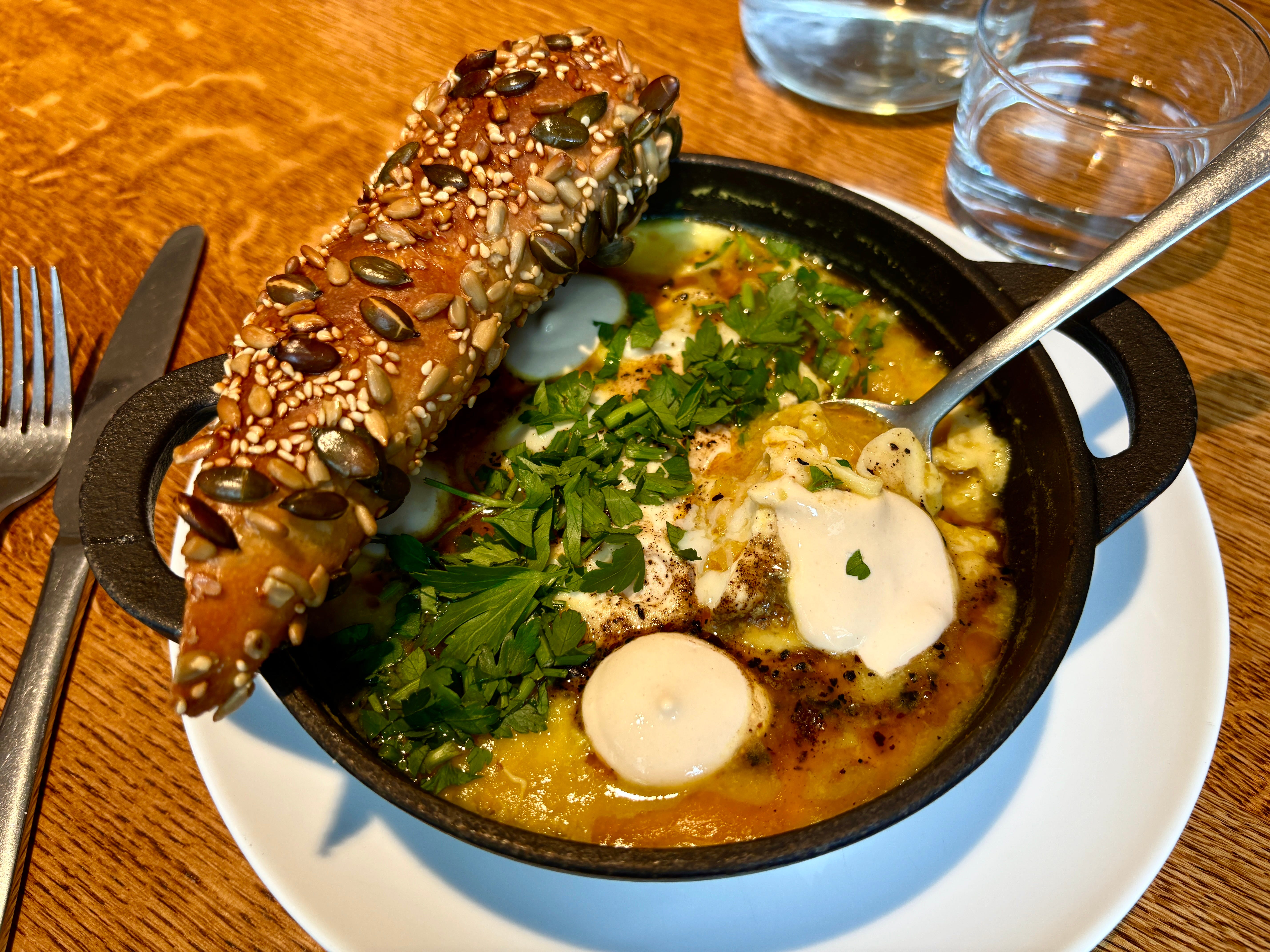 I’ve also admired their cookbooks. And now that I was on their home turf, my last meal in London was going to be at…Honey & Co. Daily. I had a very fresh fattoush salad with tomatoes, za’atar, toasted bread, pomegranate seeds, and feta, with a lively dressing with lots of lemon, which really hit the spot. I followed that with Msbaha, a dish of warm chickpeas with tahini, baked eggs, urfa chilli butter, and served with homemade seeded bread.