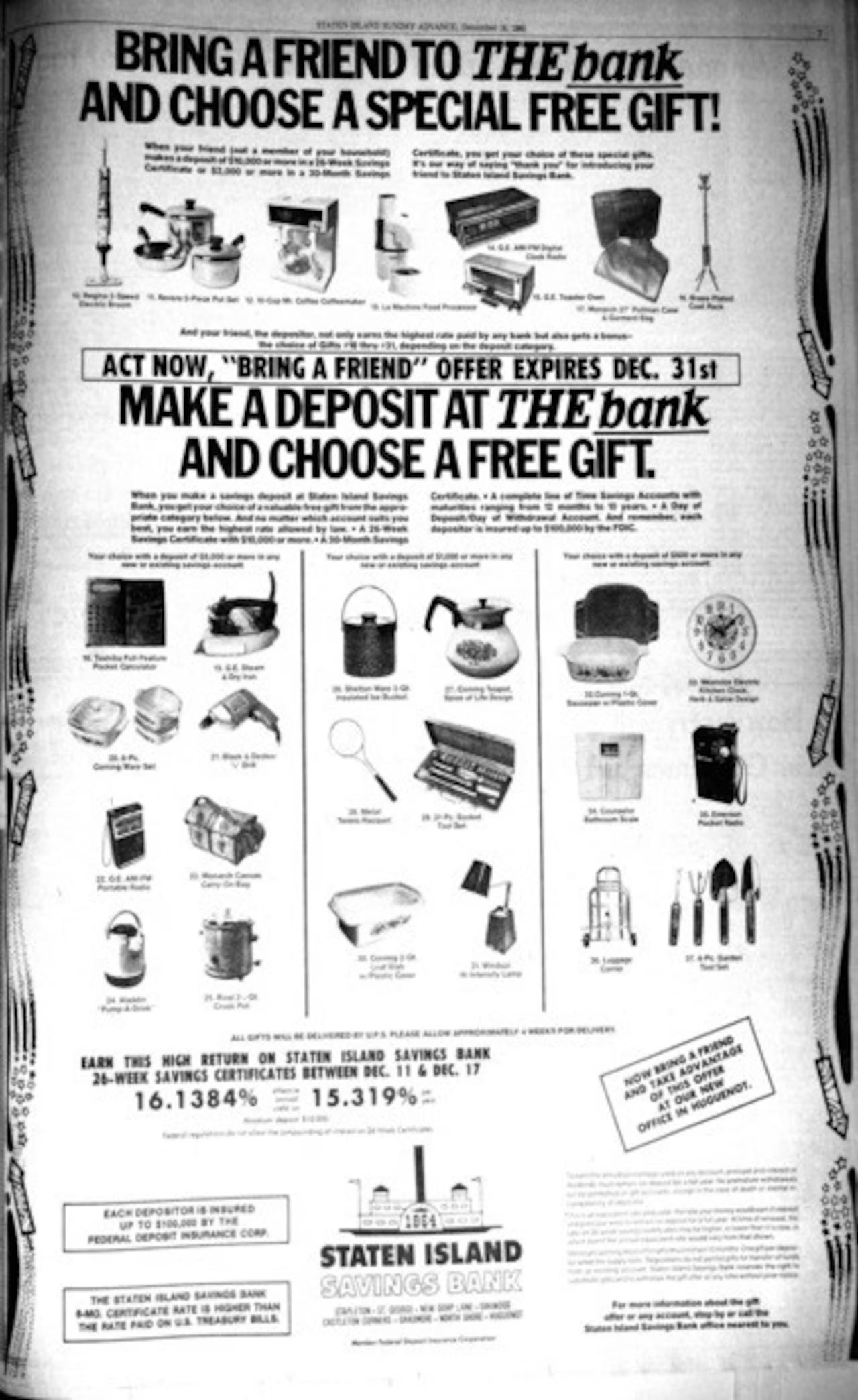 Or maybe they were a gift? Back in those days, when you opened a bank account, or brought a friend to open one, or even made a deposit, they’d give you a toaster oven, a percolator, garden tools, or a tennis racket.