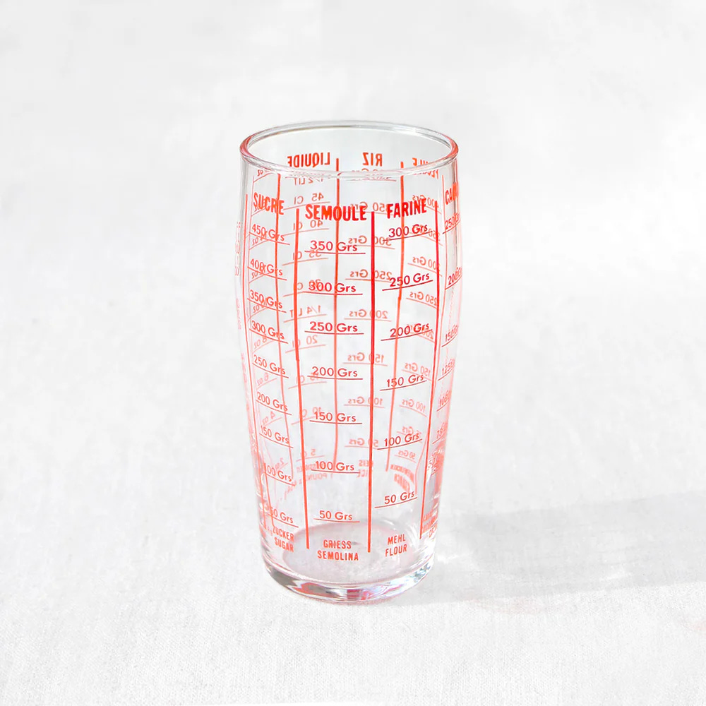They’re often marked by ingredient — semoule (semolina), farine (flour), sucre (sugar), riz (rice), and tapioca, the last of which is interesting because I’ve never seen anyone use tapioca here in a recipe, and I don’t know any French dishes that use it. So I did a quick online search and found a bunch of them here, but anyone faulting American measuring cups for not being an exact way to bake, I think I spot markers for flour on that glass, which is also in German. (On a related note, I’ve come across recipes in France that call for a “wine glass” of milk or a “coffee spoon” of baking powder, which aren’t exactly precise…I’m just saying…)