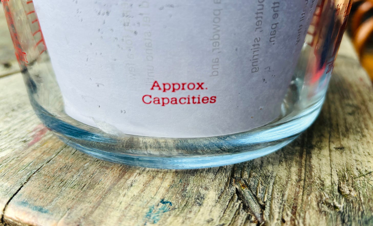 And to make matters worse, each cup had a printed warning that the cups may not be accurate either. When your sole job is to be accurate, and you can’t promise that, you’d better rethink your place in the world, and in my kitchen, monsieur PYREX. (The one in all caps.)